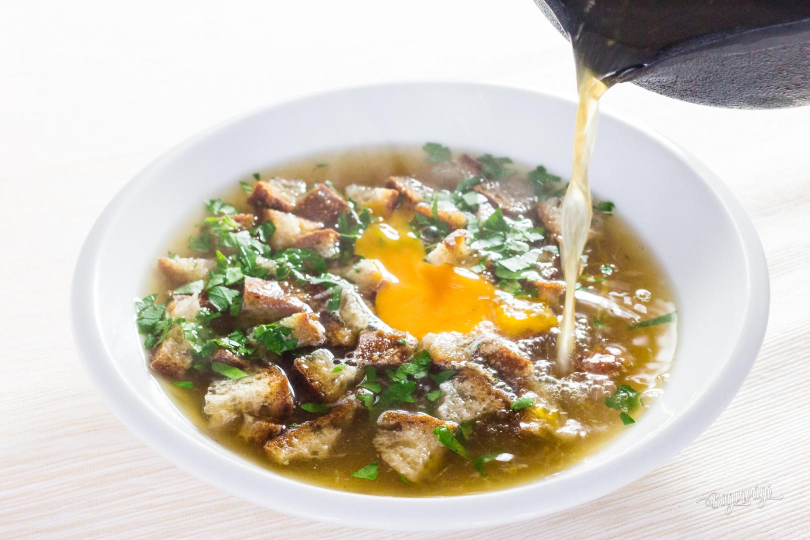 - Vývar alebo cesnačka: Silný kurací alebo hovädzí vývar doplní elektrolyty a aminokyseliny, ktoré podporujú regeneráciu organizmu. Cesnačka obsahuje alicín, látku s protizápalovými a antioxidačnými účinkami, ktorá podporí detoxikáciu pečene.