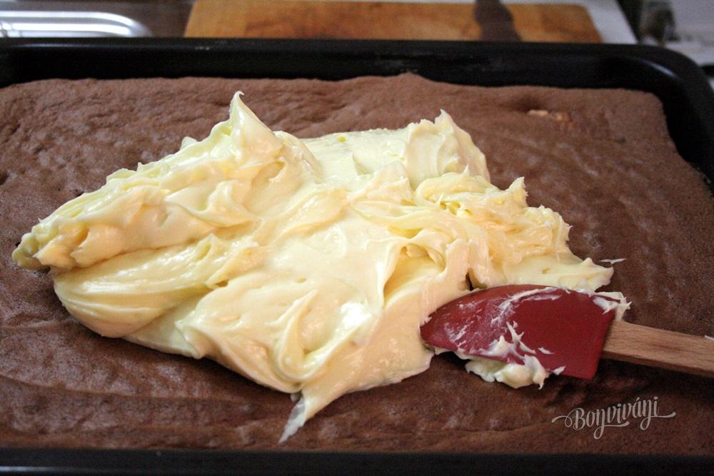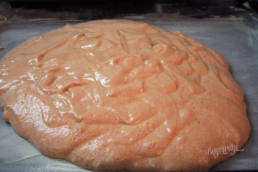 Najskôr vyšľaháme do tuha bielky. Postupne všľahávame cukor a olej, potom žĺtky a nakoniec múku rozmiešanú s kypriacim práškom a kakaom. Túto hmotu vylejeme na vymastený a múkou vysypaný plech a stierkou uhladíme od stredu ku krajom. Pečieme v rúre na 180 stupňov asi 15 - 20 minút. Rúru skôr neotvárajte a vyskúšajte drevenou špajdľou, či je korpus upečený. Upečený korpus necháme vychladnúť.