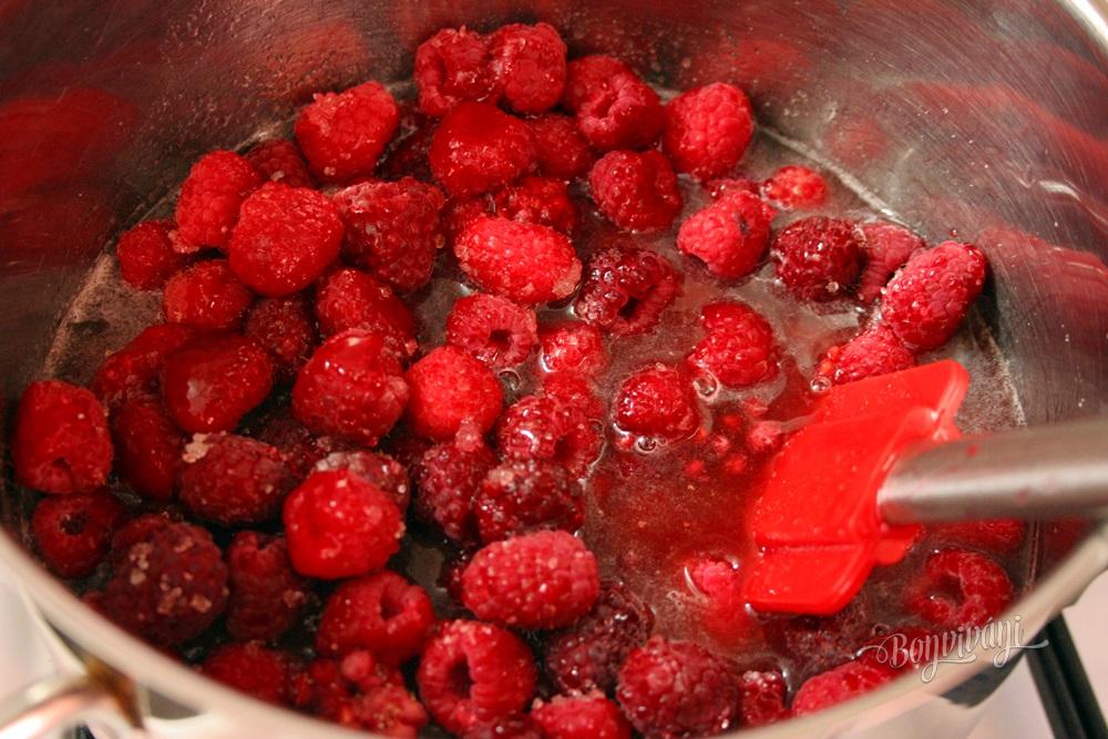V druhom hrnci necháme v malinovom sirupe zmiešanom s vodou (asi 3 deci vody a deci sirupu) nabobtnať želatínu. Po desiatich minútach želatínu krátko ohrejme, asi len na 60 stupňov - nevaríme! Vmiešame do nej maliny, premiešame a ešte spolu ohrejme na požadovanú teplotu. Hrniec necháme schladiť za občasného premiešania. Miešame len jemne, aby sa maliny nerozbili.