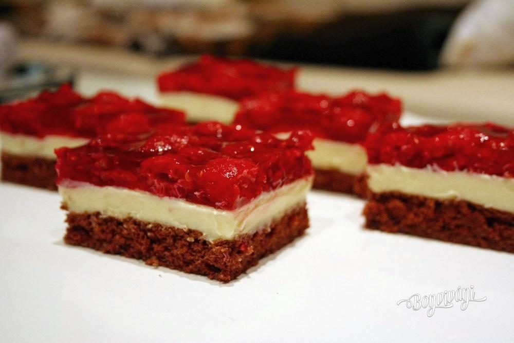 Kakaový korpus je potretý plnkou zo zlatého klasu a na vrchu sú maliny v malinovom sirupe so želatínou. Želatínu som použila klasickú cukrársku, kde na liter tekutiny treba dať 40 g. Ak máte iný druh, postupujte podľa návodu uvedenom na obale. Rozpis je na klasický plech 35x40 cm.