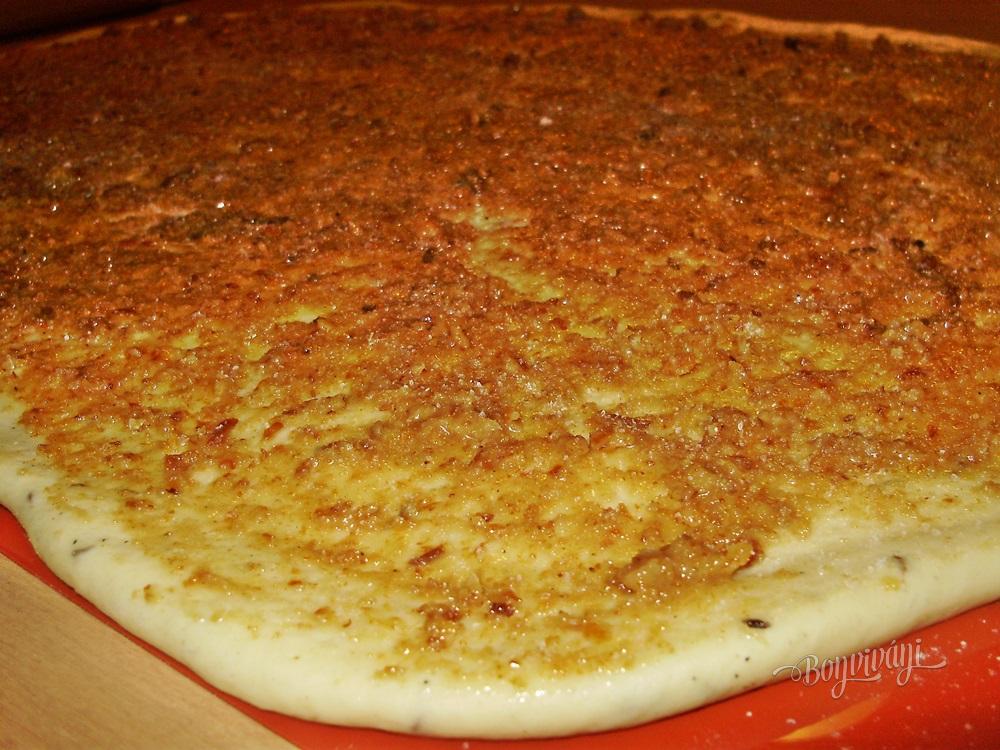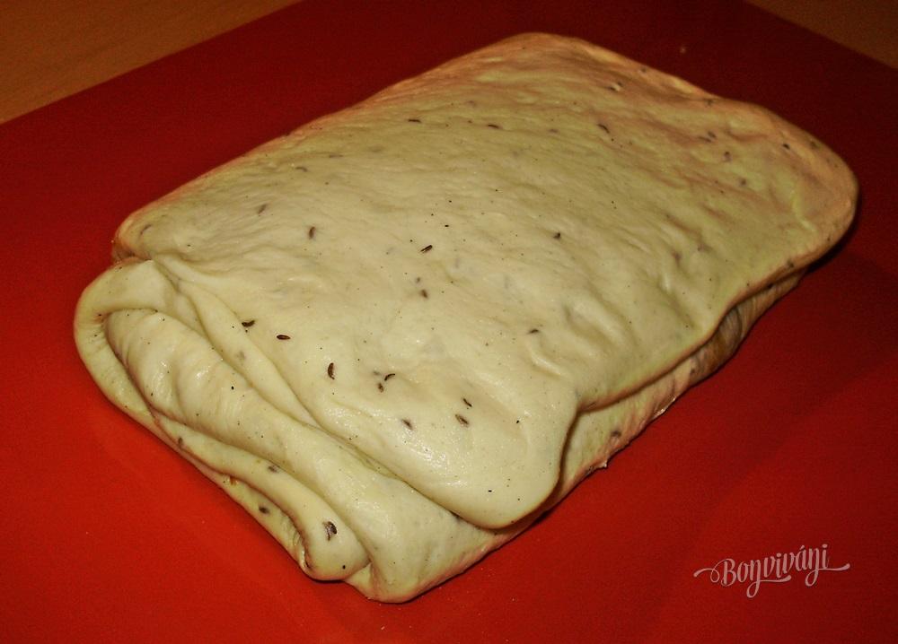 Cesto rozvaľkáme na obdĺžnik hrubý asi pol centimetra. Potrieme ho pomletými oškvarkami (nie studenými, ale vlažnými) a podľa potreby osolíme. Ak sú oškvarky slané, tak soliť netreba.