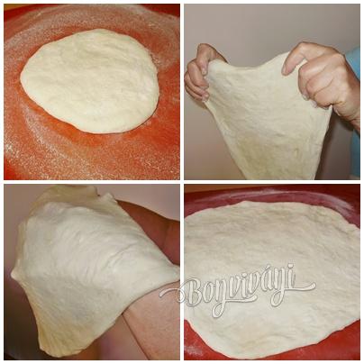 Každý kus cesta trocha pomúčime a rukami najskôr povyťahujeme okraje. Potom chrbátom rúk povyťahujeme cesto od stredu ku krajom. Takto vytiahnuté cesto som položíme na suché plechy. A už treba rozpáliť rúru na maximum.