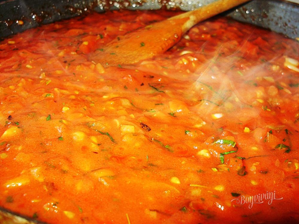 Omáčka: Na panvičke na olivovom oleji orestujeme na jemno nasekané rajčiny s cibuľkou, pridám trocha rajčinového pretlaku. Omáčku necháme zredukovať na hustejšiu konzistenciu. Nakoniec pridáme rozotretý cesnak a nasekané čerstvé bylinky. Bazalka je najlepšia, ak nemáte tak oregano a tymián.