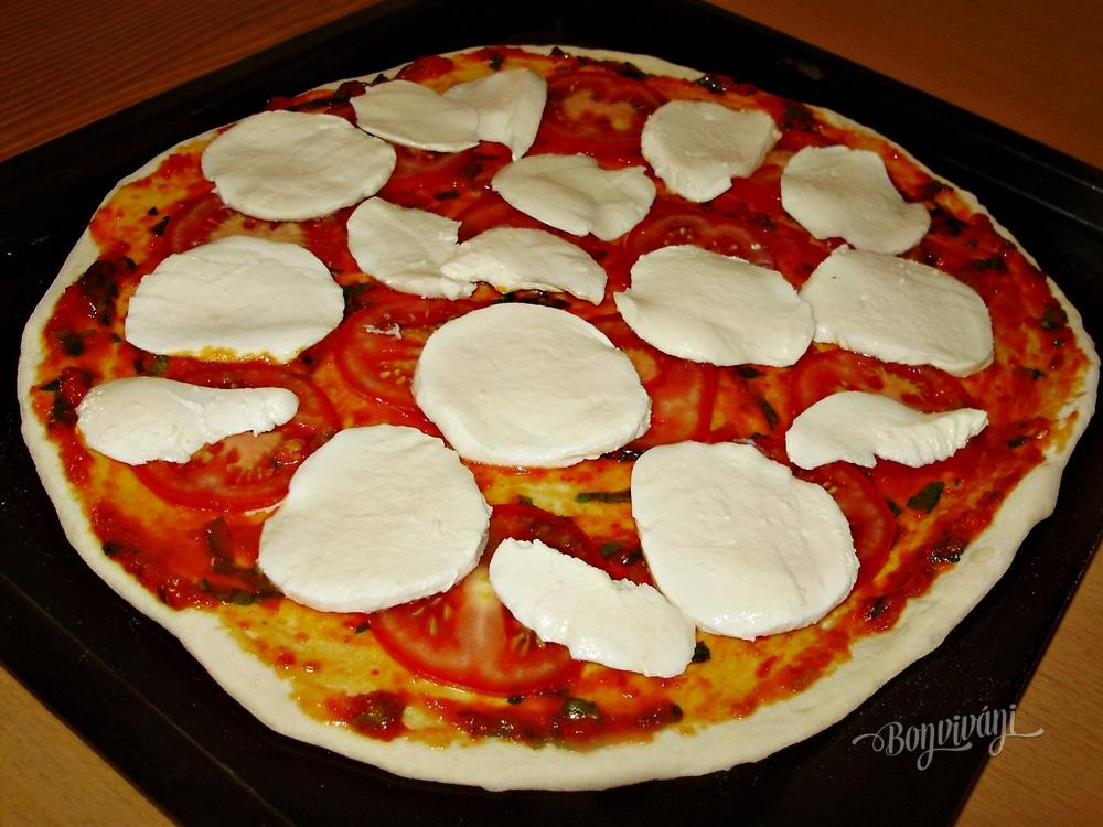 Vychladnutú omáčku natrieme na pizzové cesto. Dôležité však je nenatrieť toho na pizzu veľa - nepodmočiť ju. Na pizzu rozložíme kolieska paradajky a mozarelly.