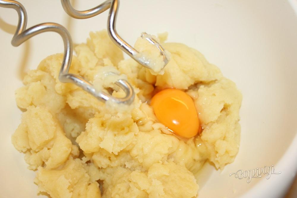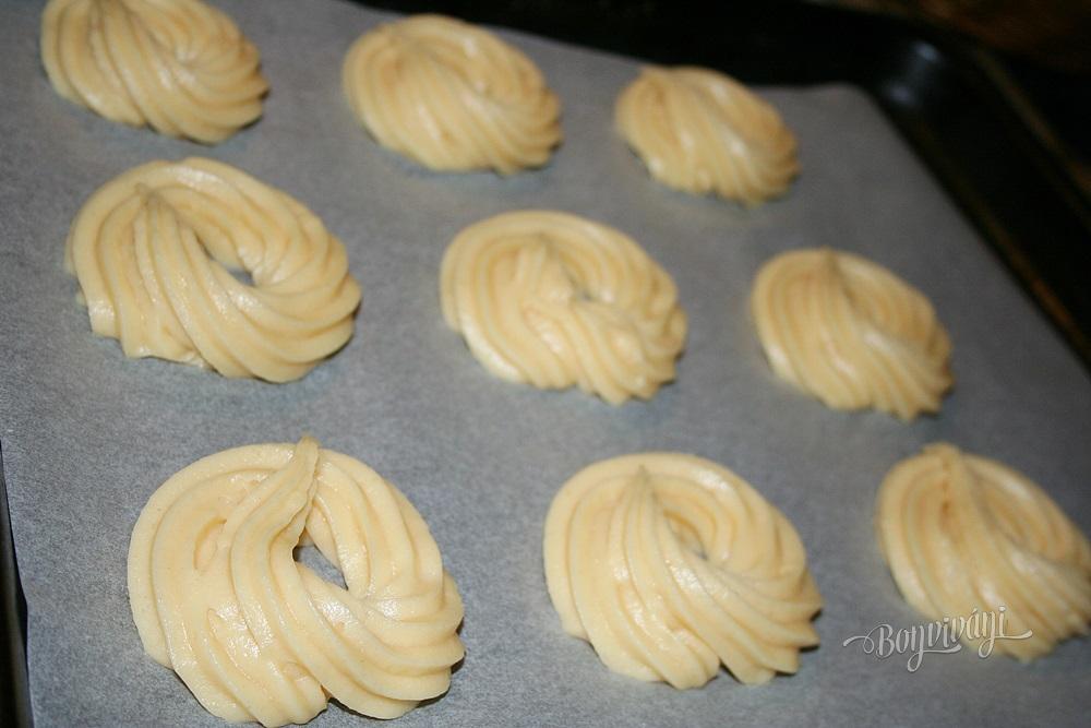 Hmotu striekame na vymastený plech do okrúhleho tvaru pomocou širšej vrúbkovanej špičky. Následuje pečenie, kedy rúra musí byť dobre predohriata na 200 stupňov. Vložíme do nej plech a predpiekame aspoň 20 minút, pričom rúru nesmieme otvoriť. Keď korpusy dosiahnu väčší objem (nafúknu sa) a začnú sa mierne zafarbovať, znížime teplotu o 40 stupňov, rúru troška pootvoríme, asi na pol centimetra. Robí sa to preto, aby mohla odísť von prebytočná para. Takto dopekáme - sušíme podľa potreby asi 10 minút. Musíme však rúru sledovať. Skúšku spravíme tak, že po 25 minútach rýchlo vyberieme jeden korpus a nožíkom ho rozkrojíme.