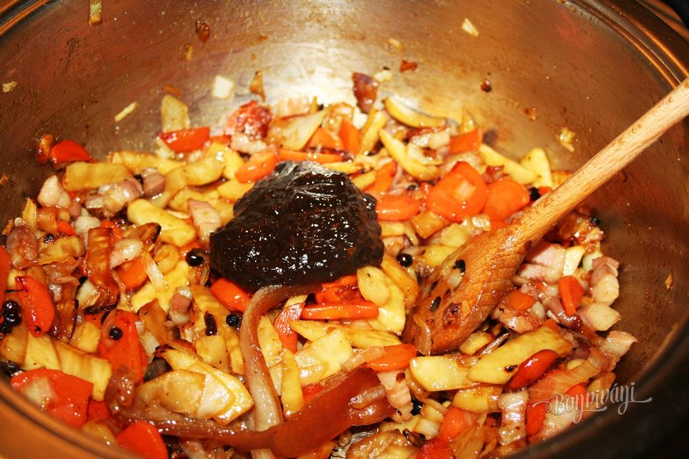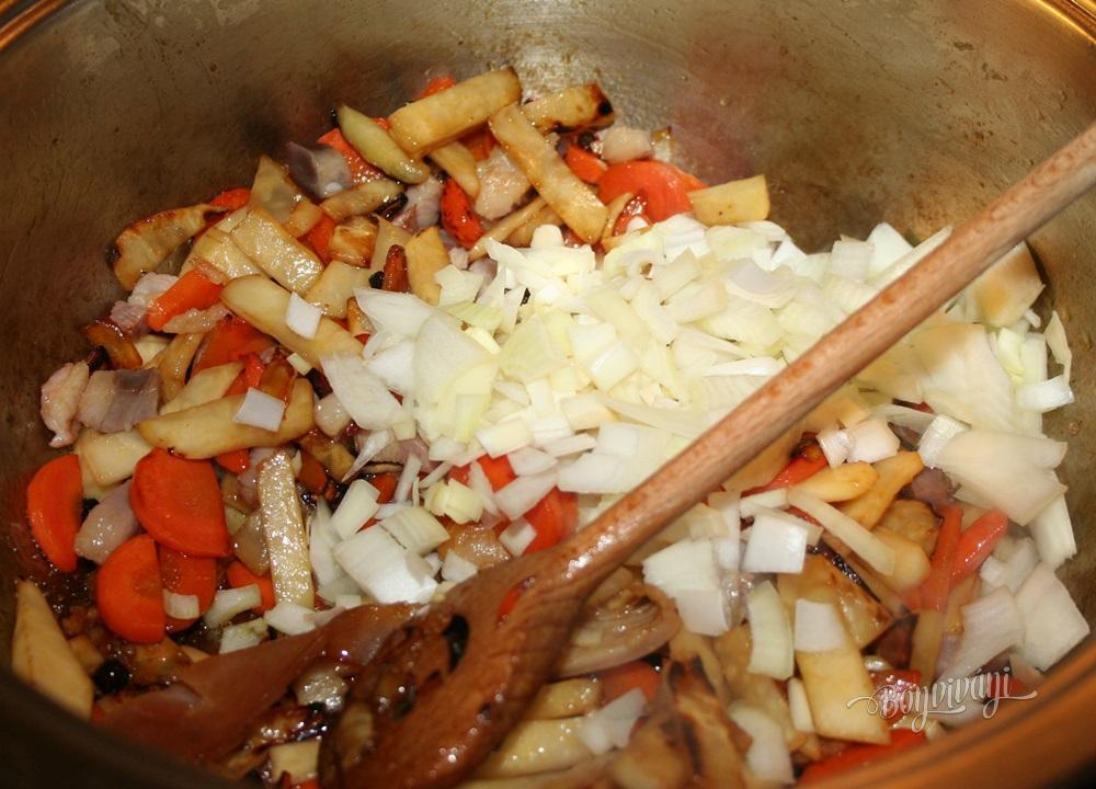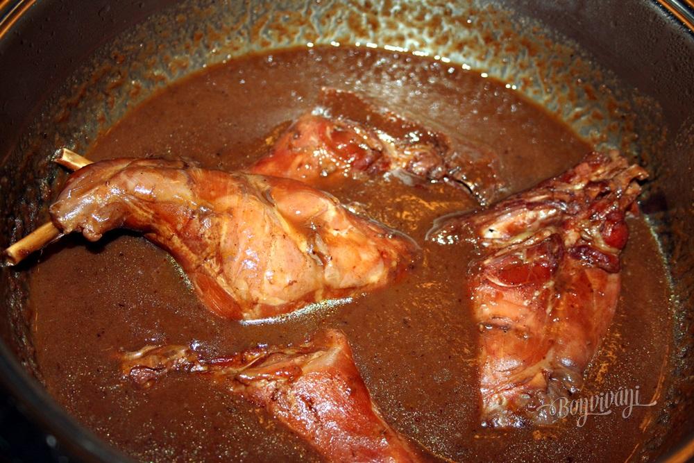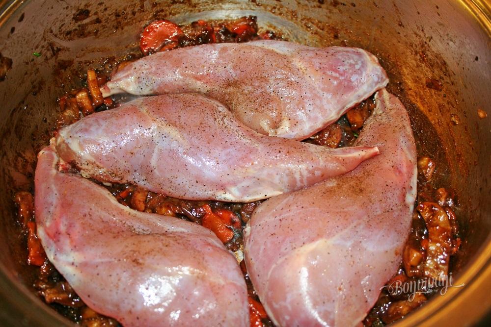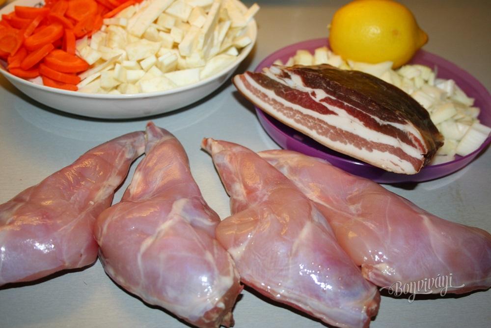 Najskôr očistíme zeleninu, nakrájame ju a zajaca osolíme a posypeme mletým čiernym korením. Ak máte králika staršieho, môžete ho prešpikovať slaninou. Ja som mala mladučké mäso, tak som slaninu dala len do základu. V hrnci na troške oleja, alebo masti orestujeme pokrájanú zeleninu. Za stáleho miešania restujeme, dokiaľ zelenina nezozlátne. Keď už je zelenina orestovaná, dáme ju v hrnci kúsok na okraje a do stredu nasypeme cukor, ktorý sa upáli na karamel. Premiešame a až teraz pridáme cibuľu so slaninou a koreniny. Opäť restujeme, dokým nebude cibuľa mäkká a slanina opečená.