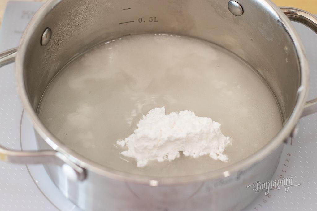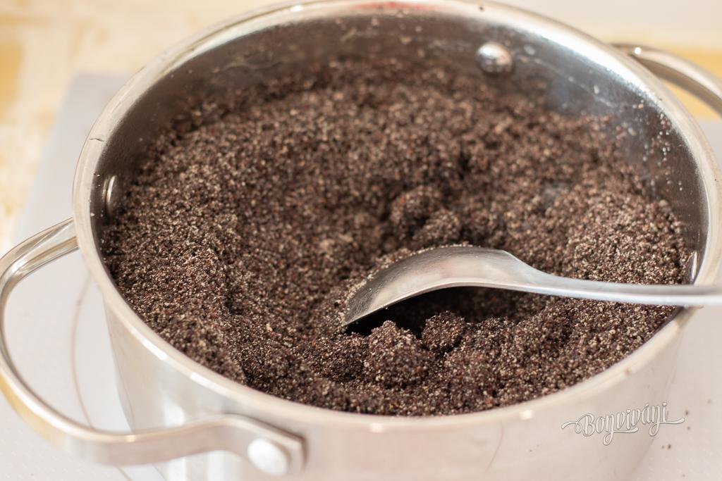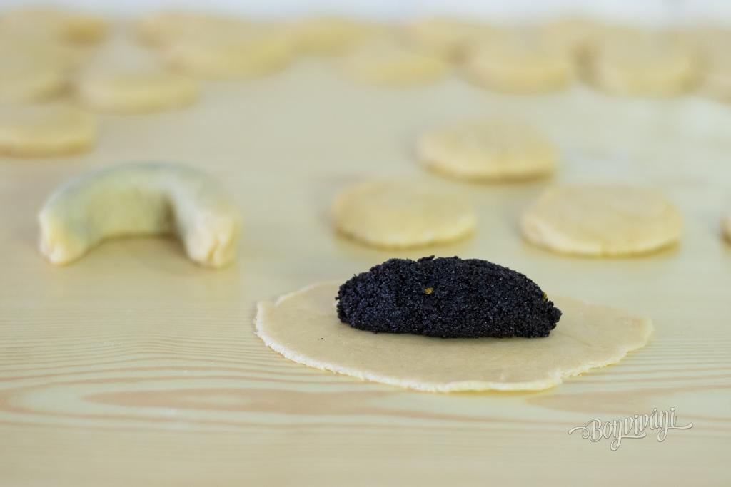 Medzitým si pripravíme plnku. Cukor rozpustíme vo vode a zohrievame. Pridáme pomletý mak, za stáleho miešania zohrievame dovtedy, kým sa mak zahustí. Do chladnúcej náplne pridáme nastrúhanú kôru z citróna. Po vychladnutí by mala byť zmes taká hustá, aby sa dali z nej rukou robiť šúľance. Ak je ešte riedka, môžeme ju zahustiť postrúhaným perníkom.