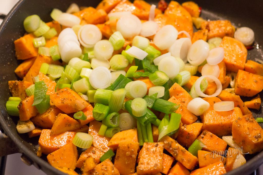 Vopred namočený cícer dáme variť do hrnca zaliaty vodou asi 2 cm nad povrchom cíceru. Kým sa varí, nakrájame na kúsky batáty, nadrobno papričky a cesnak, nastrúhame zázvor a rozdrtíme v mažiari koriander na jemno.