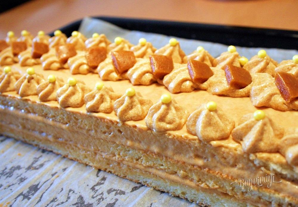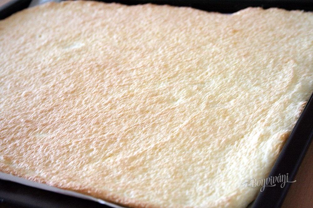 Po vychladnutí cesto na trikrát po dĺžke prekrojíme. V mlieku s cukrom uvaríme puding a necháme ho vychladnúť. Občas premiešame. Do vychladnutého pudingu prišľaháme zmäknuté maslo. Krémom natrieme tri diely korpusu, troška aj povrch a zbytok vložíme do vrecúška a ozdobíme. Dáme do chladničky stuhnúť a nakrájame úhľadné rezy.