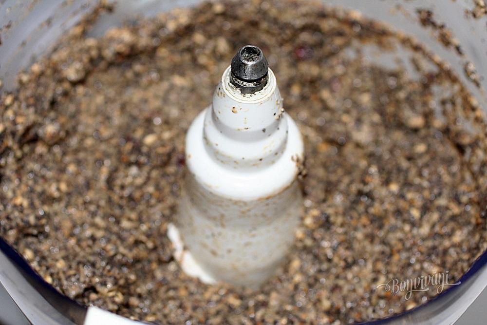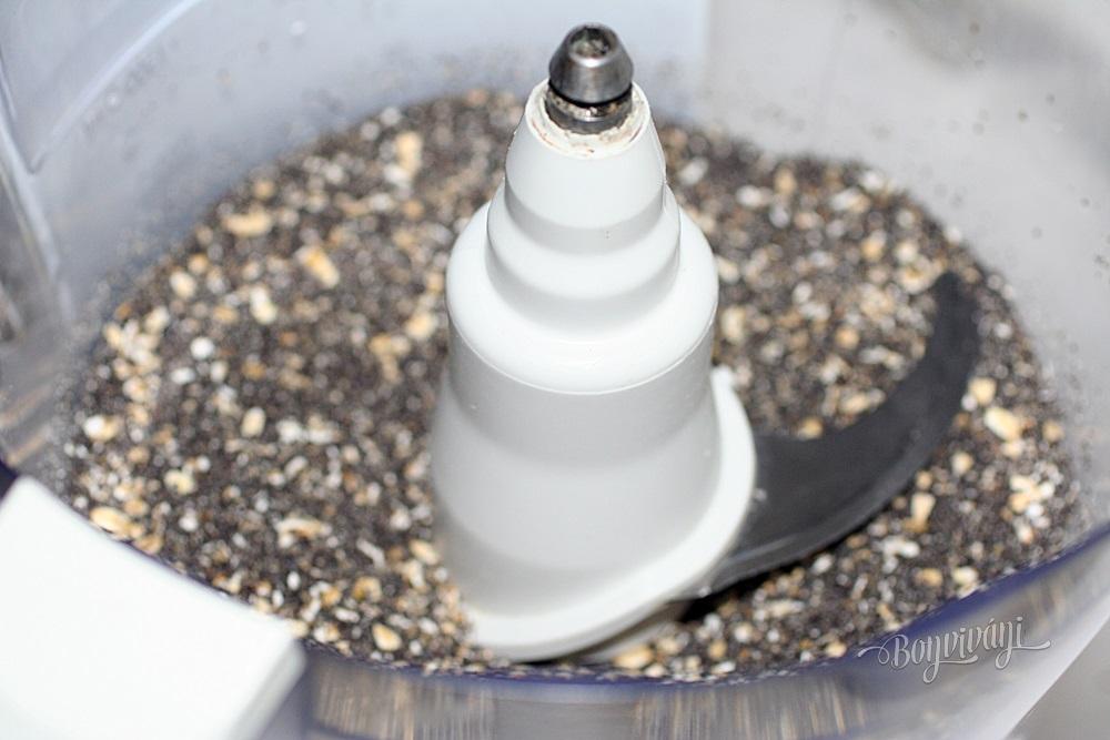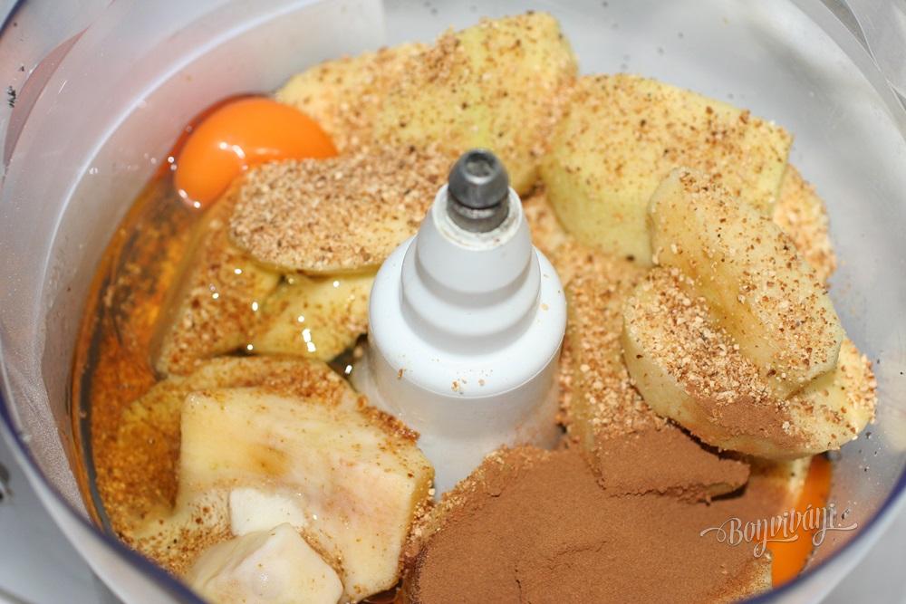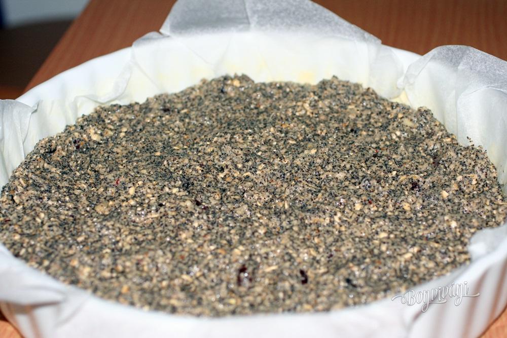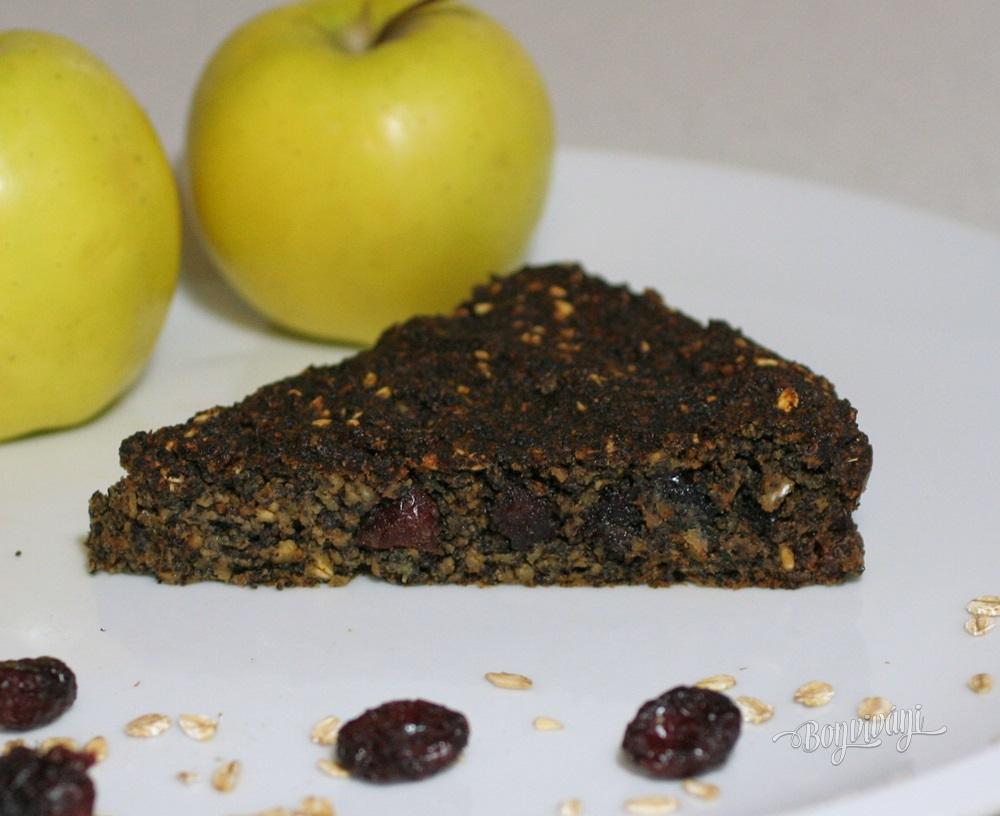 Do mixéra s nožíkmi nasypeme ovsené vločky a mletý mak. Krátko rozmixujeme, aby sa vločky pomleli na jemno. Pridáme očistené jablká, ochutíme škoricou, kôrou, pridáme med, vajíčka, sódu a brusnice. Znovu premixujeme a zjemníme mliekom podľa potreby. Záleží od šťavnatosti jabĺk. Cesto nesmie byť tuhé, malo by sa liať ako piškóta. Ak sú jablká suchšie, pridajte po lyžici ešte trocha mlieka.