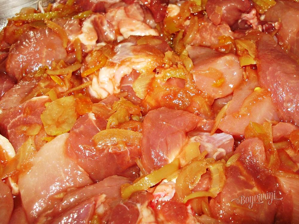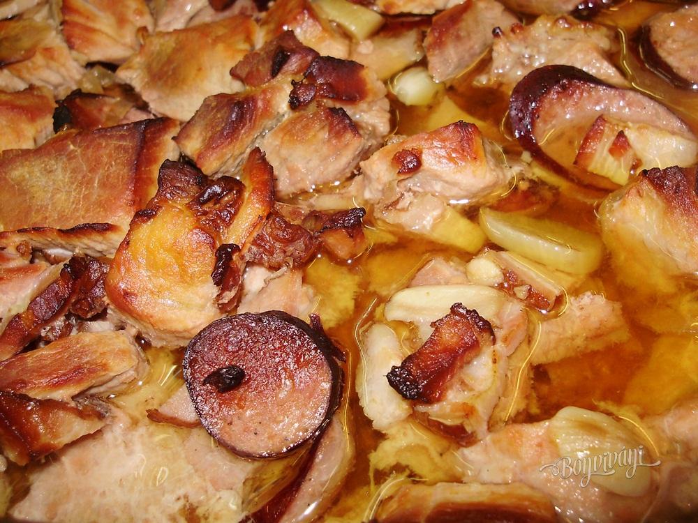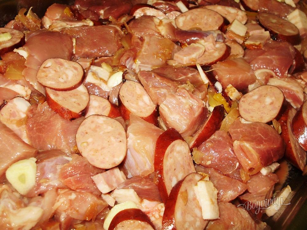 Bravčové mäso nakrájame na kocky. Podľa potreby osolíme a pridáme mleté čierne korenie. Klobásy a slaninu treba ochutnať, či nie sú príliš slané, potom so soľou opatrne. Pridáme nakrájanú cibuľu, prilejeme trochu leča a premiešame. Pridáme kolieska klobásy, prúžky slaniny a prihodíme pár strúčikov cesnaku na vôňu. Podlejeme troškou vody, zakryjeme pekáčik a dáme piecť. Pred koncom pečenia pekáčik odokryjeme a dopečieme. Podávame s varenými zemiakmi, alebo len s chlebíkom.