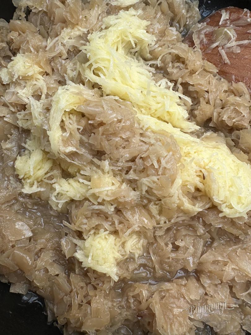 Na masti, alebo inom tuku v kastróli orestujeme na kocky nakrájanú cibuľu. Keď cibuľa zmäkne, pridáme k nej cukor a spolu s cibuľou za stáleho miešania necháme skaramelizovať. Medzitým zlejeme vodu z kvasenej kapusty ale nevylejeme ju, odložíme pre prípad, ak bude treba kapustu dochutiť. Scedenú kapustu poprekrajujeme nožom na menšie kusy a vložíme ju do kastróla na skaramelizovanú cibuľu. Podlejeme vodou a dusíme aspoň hodinu. Občas premiešame a podľa potreby dolejeme vodu, alebo ak je kapusta sladšia, tak dolejeme odloženú kapustovú vodu.
