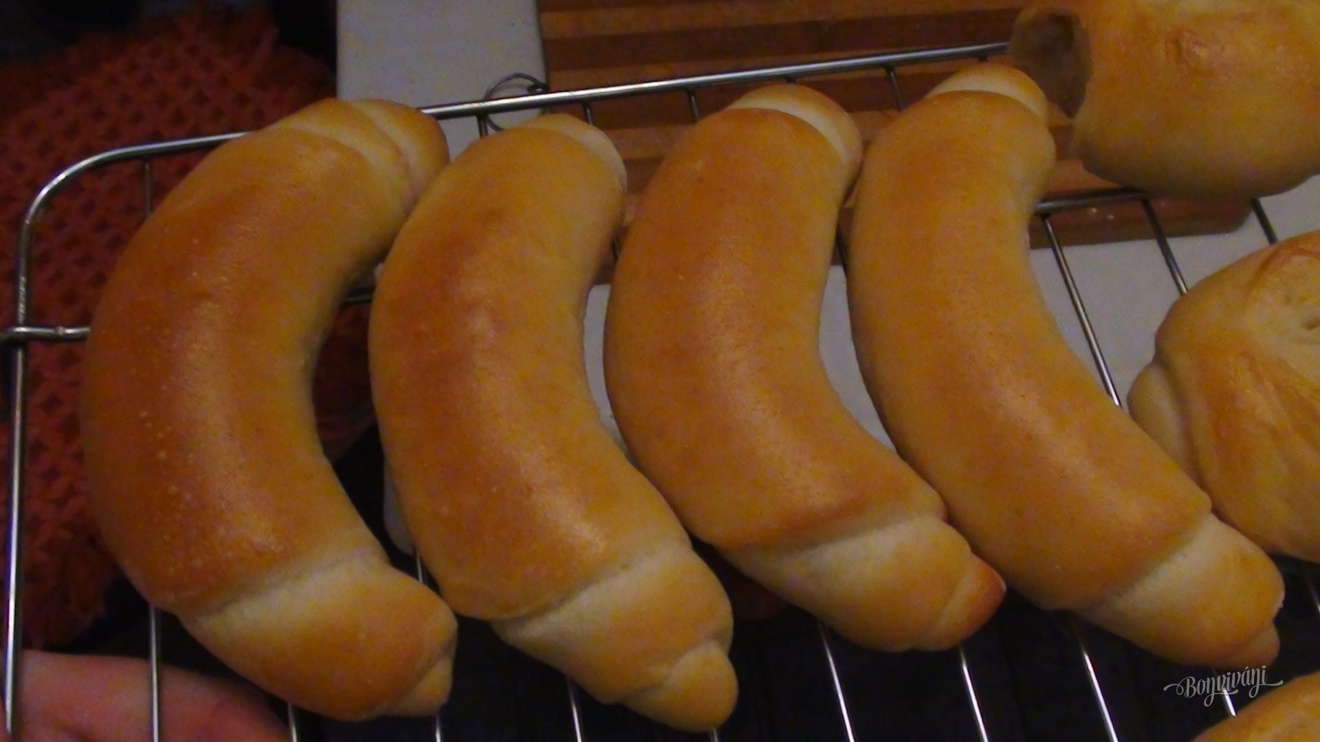 Polovicu guliek necháme ďalej kysnúť, to budú žemle. Druhú polovicu spracujeme na rožky. Vyvaľkáme guľku do dvoch tretín, aby koniec ostal tučnejší. Cesto zavinieme do tvaru rožka a dlaňou ešte rozvaľkáme, aby rožok držal tvar.