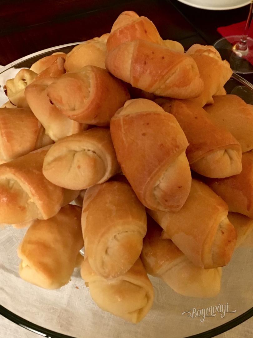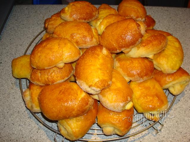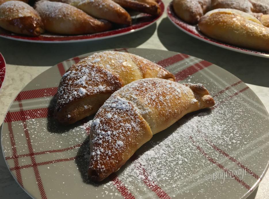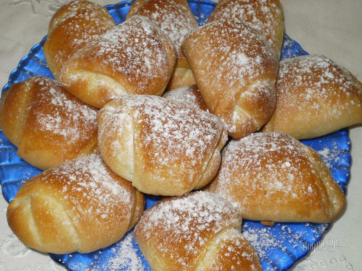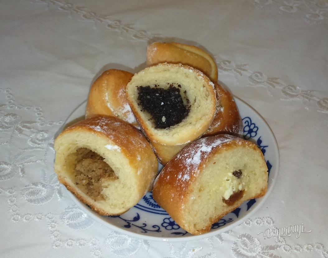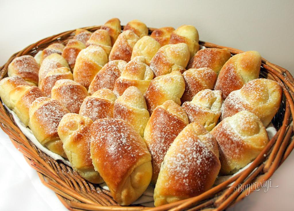 Cesto rozdelíme na desať malých častí, z ktorých vytvoríme bochníčky a necháme ich bokom. Vždy vezmeme jeden, na pomúčenej podložke rozvaľkáme do veľkosti plytkého taniera a rozdelíme na 8 časti. Na každý kúsok trojuholníka dáme na širšiu časť lyžicu plnky, okraje podsunieme a zavinieme rožok. Plnku pripravíme z jemného, scedeného tvarohu, jedného vajca, vanilky, mletého cukru, krupice (aby plnka nevytekala), zjemníme mäkkým maslom, nastrúhame kôru z citróna a pridáme hrozienka. Plnka nie je riedka.