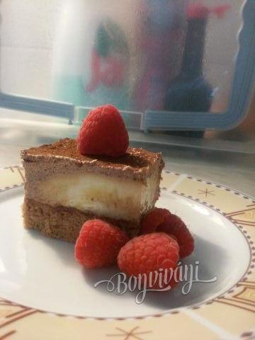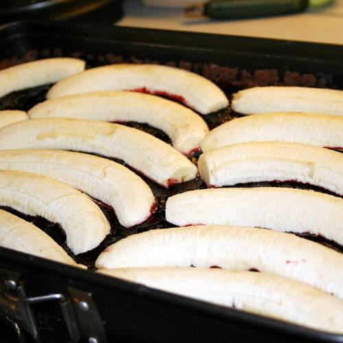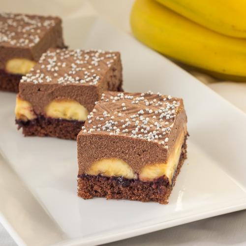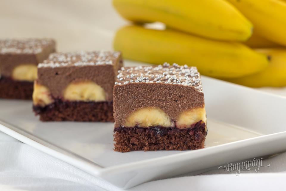 Najprv v miske vyšľaháme do tuha bielky s cukrom, potom pridáme žĺtky rozmiešané s lyžicou vody a nakoniec do snehu vmiešame preosiatu múku spolu s kakaovým práškom. Dáme piecť na plech s papierom na 200 stupňov. Cesto po vychladnutí potrieme džemom podľa chuti. Banány očistíme, pozdĺžne na polovinu prekrojíme a poukladáme na korpus.