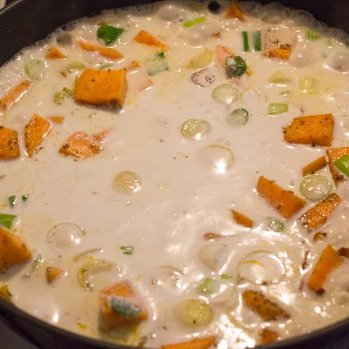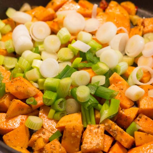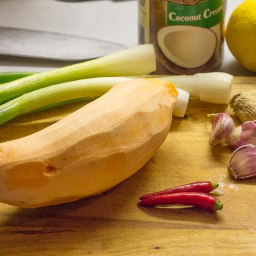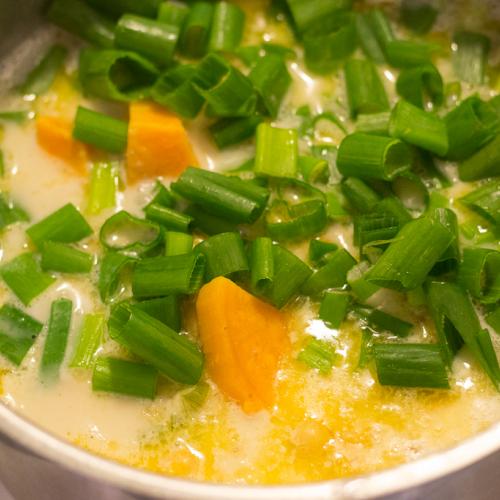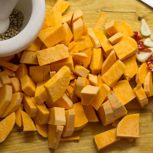 Vopred namočený cícer dáme variť do hrnca zaliaty vodou asi 2 cm nad povrchom cíceru. Kým sa varí, nakrájame na kúsky batáty, nadrobno papričky a cesnak, nastrúhame zázvor a rozdrtíme v mažiari koriander na jemno.