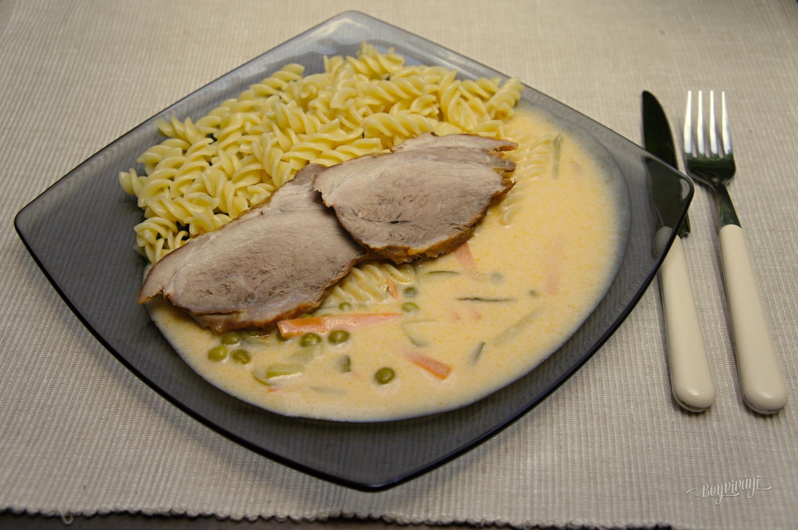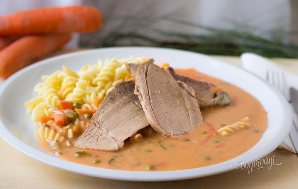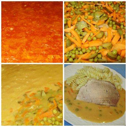 Mrkvu očistíme a nakrájame na rezančeky, vložíme zvlášť do druhého hrnca. Pridáme pokrájané sladko-kyslé sterilizované uhorky a hrášok. Podlejeme troškou vody a pomaly dusíme do polomäkka, aby nebola mrkva rozvarená. Omáčku (bez zeleniny) zahustíme múkou rozmiešanou v mlieku. Pomaly povaríme aspoň 20 minút. Potom omáčku prepasírujeme (precedíme) do druhého hrnca, zjemníme smotanou a pridáme udusenú zeleninu. Prevaríme už len 5 minút za stáleho miešania. Chuť vylepšíme citrónovou šťavou.