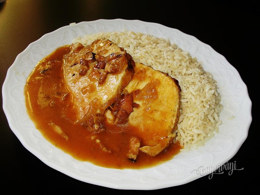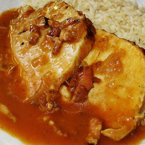 Jednoduchý recept na dusnú bravčovú pečienku (karé bez kosti). Omáčka chutí a vonia opraženou anglickou slaninou. Niečo ako klasická cigánska bravčová pečienka. Podáva sa s ryžou, alebo varenými zemiakmi.