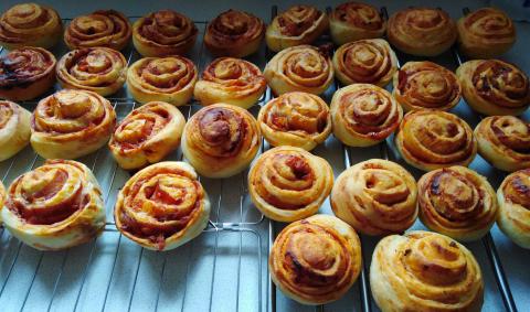 Keď prídeme ku stredu, rádielkom cesto prekrojíme. Vzniknú nám dva záviny, troška ich dlaňou sploštíme a nožom cik-cak nakrájame. Poukladáme ich na plech s papierom na pečenie a necháme asi 15 minút nakysnúť. Potom ich potrieme bielkom, čo nám zostalo z vajca a pečieme vo vyhriatej rúre na 220 stupňov. Pečieme asi 12-15 minút.