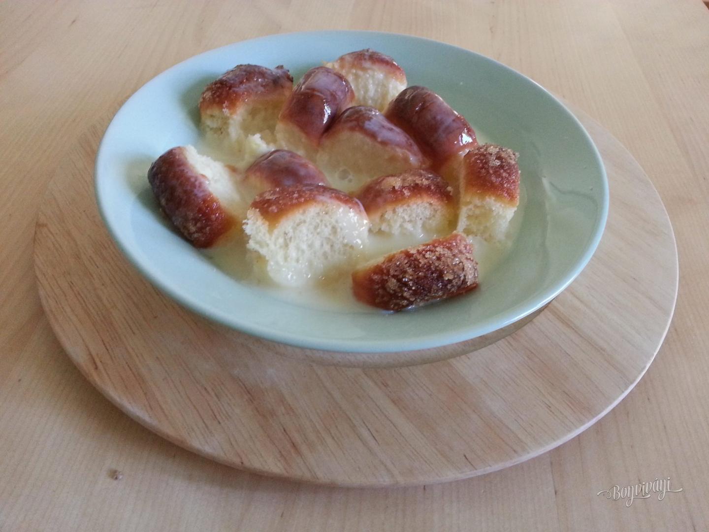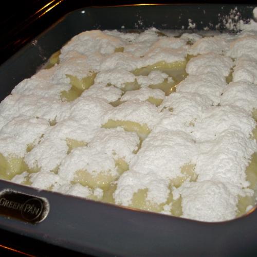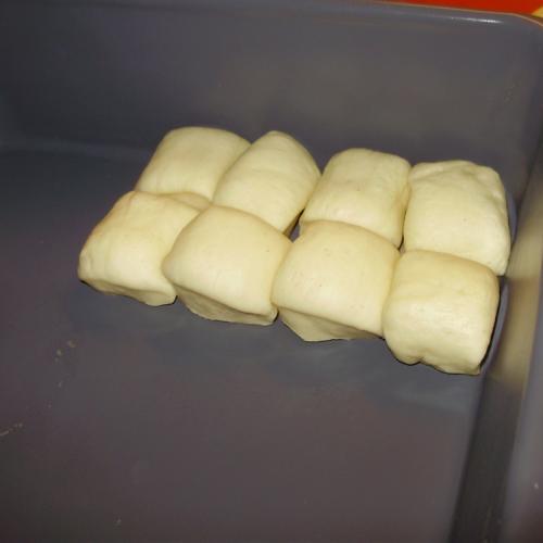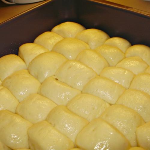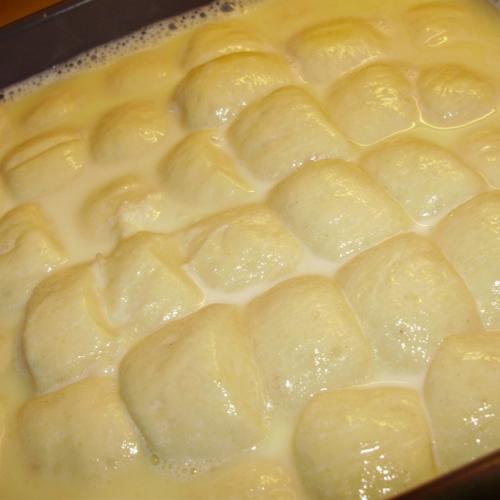 A teraz nastáva ten okamih, ktorý z obyčajných buchtičiek urobí famózne buchtičky s cukrovou krustou. Buchtičky zalejeme horúcim mliekom, v ktorom je rozpustené maslo. Množstvo uvedené v surovinách je len orientačné, pretože záleží od veľkosti pekáča a od toho, ako husto máte buchtičky poukladané. Mliečno-maslová zálievka by mala pokryť celý obsah pekáča asi do 4/5. Čiže aby buchtičky v mlieku akoby plávali.