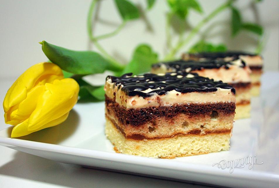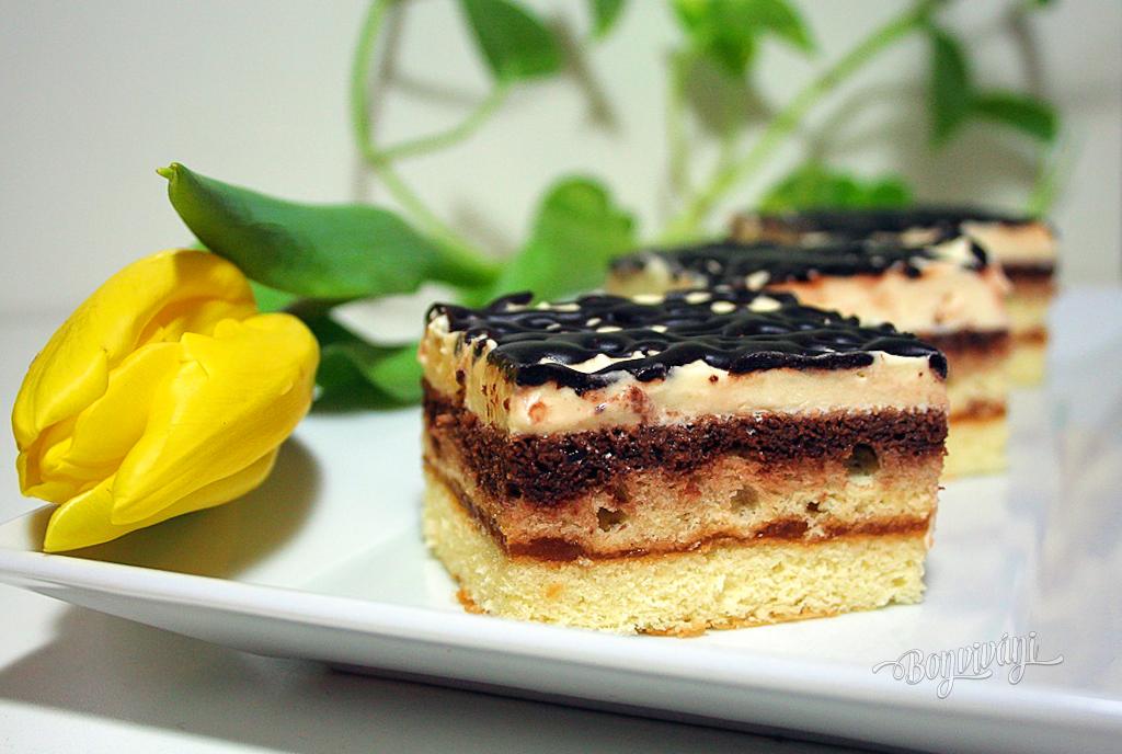 Pripravíme krém: Celé vajcia s cukrom a vanilkovým cukrom vyšľaháme nad parou do hustej peny. Necháme celkom vychladnúť! Potom vyšľaháme maslo a postupne pomaly pridávame vajcovú penu. Vyšľaháme lahodný krém, ktorý rozotrieme na vlhkú piškótu a dáme poriadne vychladiť do chladničky. Vychladené rezy poprskáme čokoládovou polevou. Necháme stuhnúť a nakrájame ostrým dlhým nožíkom namočeným v horúcej vode.