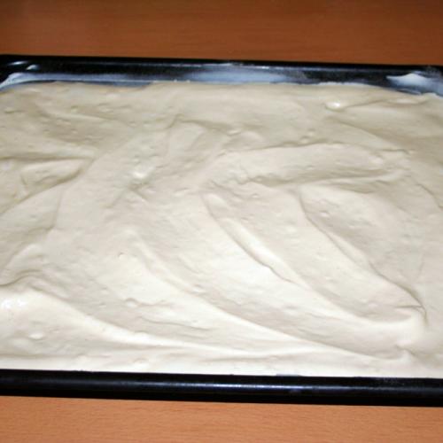 Toto cesto vylejeme na vymastený a múkou vysypaný plech (alebo na papier na pečenie). Vložíme do vopred predohriatej rúry na 180 stupňov a upečieme. Toto zopakujeme ešte raz a upečieme druhú piškótu. Po upečení necháme vychladnúť.
