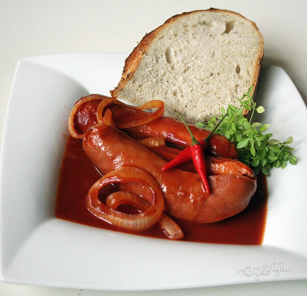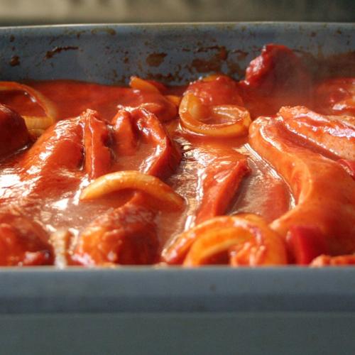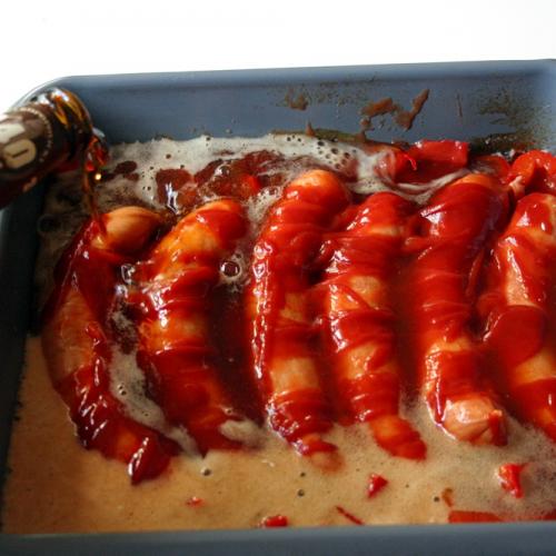 Do pekáča dáme kolieska cibule a prúžky čerstvej papriky. Na vrch poukladáme údeninu (ja som dala teľacie párky). Párky je dobré narezať a môžete ich aj prešpikovať kolieskom cibule. Už som videla aj špekáčky pokrájané na hrubé kolieska, tiež môže byť. Každý to robí ináč, ale vždy je to pochúťka. Niekto dáva aj cesnak, baranie rohy. Dôležité však je na párky naliať kečup a celé to zaliať čiernym pivom. Opäť podľa chuti kečupu môžete dosoliť, pridať korenie, cesnak, worcester, feferóny.