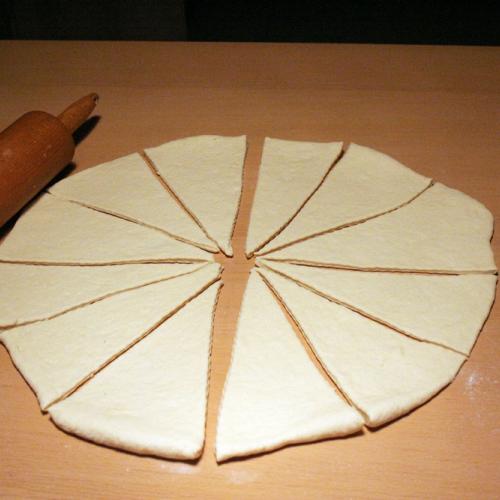 Na prípravu cesta môžeme použiť pekárničku, program miesenia a kysnutia. Alebo dáme všetky suroviny do misky a mixérom s hákmi cesto spracujeme. Cesto by nemalo lepiť, ak sa vám bude zdať riedke, prisypte troška múky, ak bude príliš tuhé, prilejte piva :-) Poriadne vypracované cesto je po vykysnutí vďaka droždiu a pivu krásne nadýchané a jemné. Vyberieme ho z pekárničky, vytvarujeme bochník, ten rozvaľkáme od stredu ku krajom, koľko sa dá. Cesto potom rádielkom rozdelíme na 12 častí.