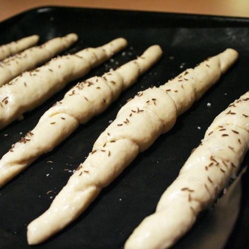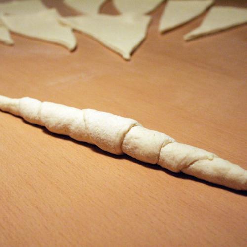 Rožky zavinieme tak, že cíp pridržiavame a širšiu stranu zavinieme smerom k cípu. Budeme mať niečo ako croissant, ale ten obomi dlaňami vygúľame na tenký dlhý rovný rožok skoro cez celú šírku plechu. Na každý plech dáme papier, alebo podložku na pečenie a poukladáme 6 rožkov, ďalej od seba. Necháme ešte asi 15 minút podkysnúť, potrieme ich bielkom čo nám ostalo z vajca a posypeme rascou a hrubozrnnou soľou. Vložíme do vopred vyhriatej rúry na 220 stupňov a pečieme asi 5 minút. Potom teplotu znížime na 180 stupňov a dopečieme ešte asi desať minút do chrumkava.