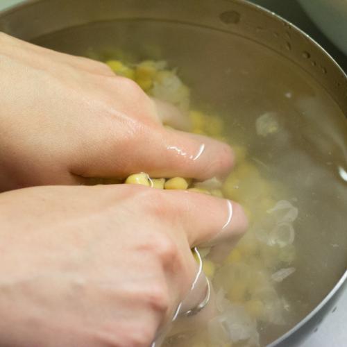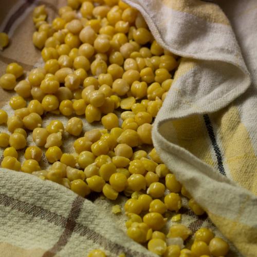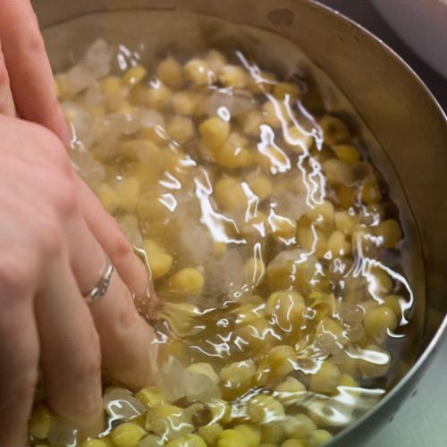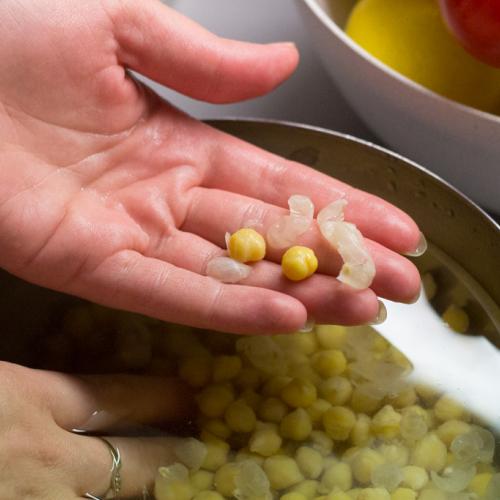 Cícer namočte do vody a poriadne ho preperte v rukách, aby sa odstránili šupky. Stačí tak zo 5-6 krát. Pustite do misky prúd vody a roztočte rukou vír. Šupky vyplávajú na povrch a ľahko ich stečením hornej vrstvy vody odstránite. Je to tak lepšie pri pečení a pripravujem takto dokonca aj hummus, aby bol krémovejší.