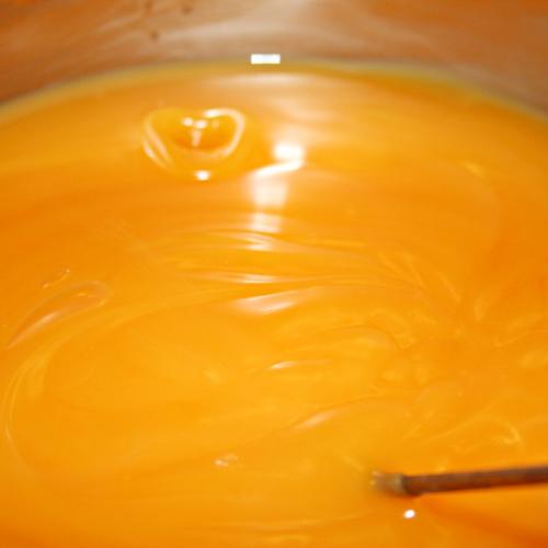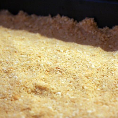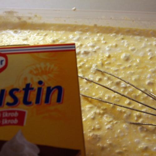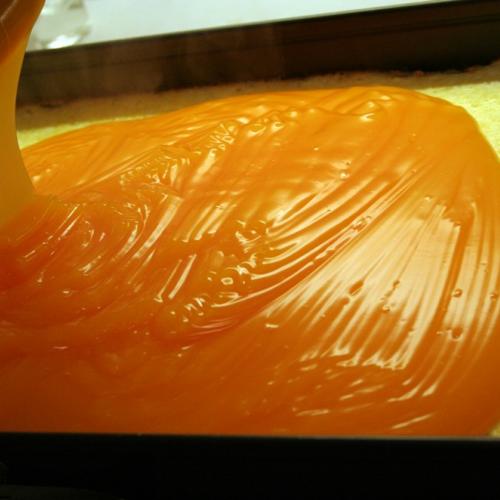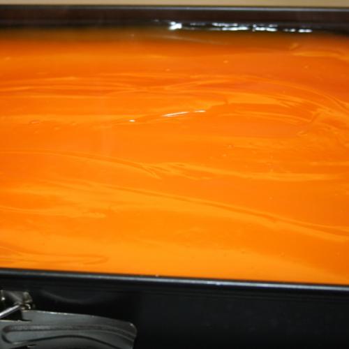Túto hmotu prelejeme na utlačenú drobenku, uhladíme do rovna a vložíme do vopred vyhriatej rúry na 170 stupňov. Pečieme približne 50 minút. Po upečení necháme koláč trochu vychladnúť. Medzitým uvaríme želé na polevu. Do hrnca dáme nejaký kvalitný hustý 100% džus, ja som použila mangový, má peknú farbu a krásne vonia. Pridáme aj deci sirupu, tiež použite hustý, kvalitnejší, buďto mango, alebo pomarančový sunquick. Prisypeme škrob a za stáleho miešania privedieme k varu. Ak by sa vám zdalo želé husté, prilejte troška vody a povarte asi minútu.