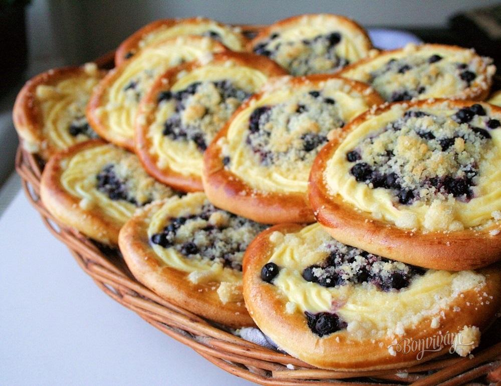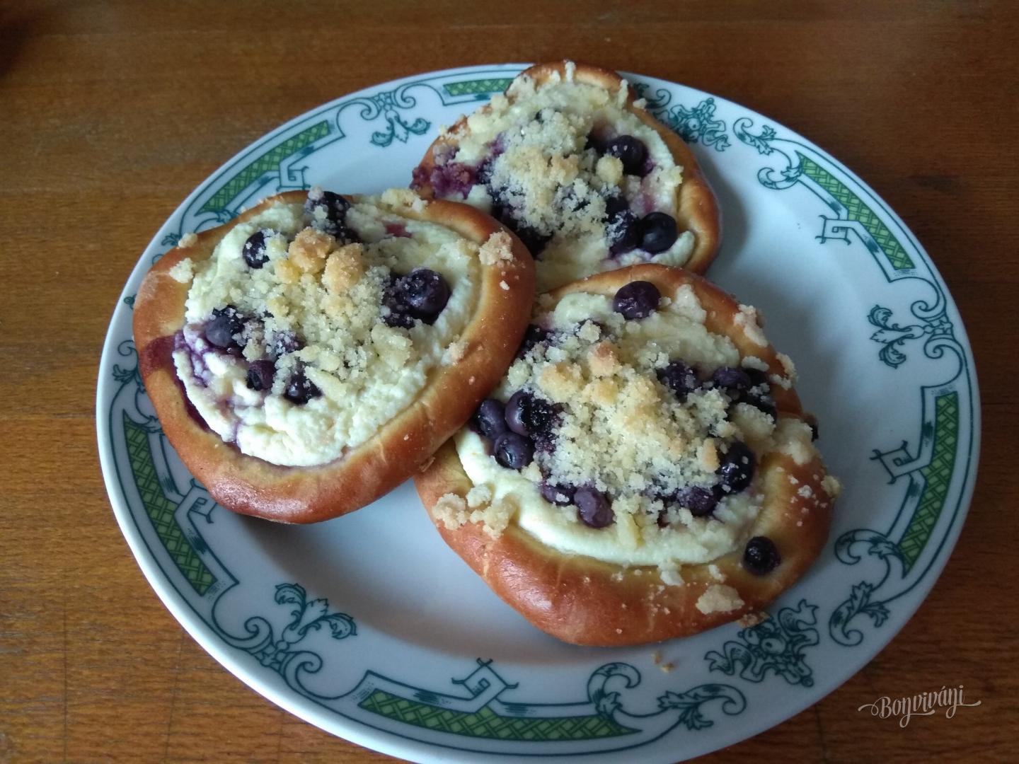 Z uvedených surovín spracujeme kysnuté cesto. Kým cesto vykysne, pripravíme si drobenku a dáme ju do chladničky. Tiež pripravíme tvarohovú plnku. Po vykysnutí cesto rozdelíme na 16 častí a narobíme maličké bochníčky. Každú bochník jemne rozvaľkáme a rukami vytiahneme od stredu ku krajom, ako keď robíme langoše. Tým bude okraj vyšší a stred kruhu tenučký.