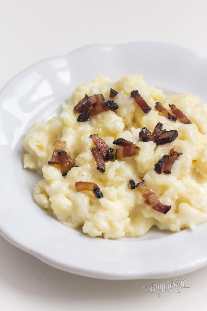 Halušky vyberieme cedníkom do misky a premiešame s bryndzou. Už len uškvariť poctivú slaninku a môžeme podávať :)