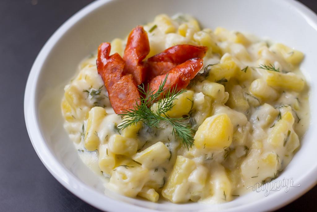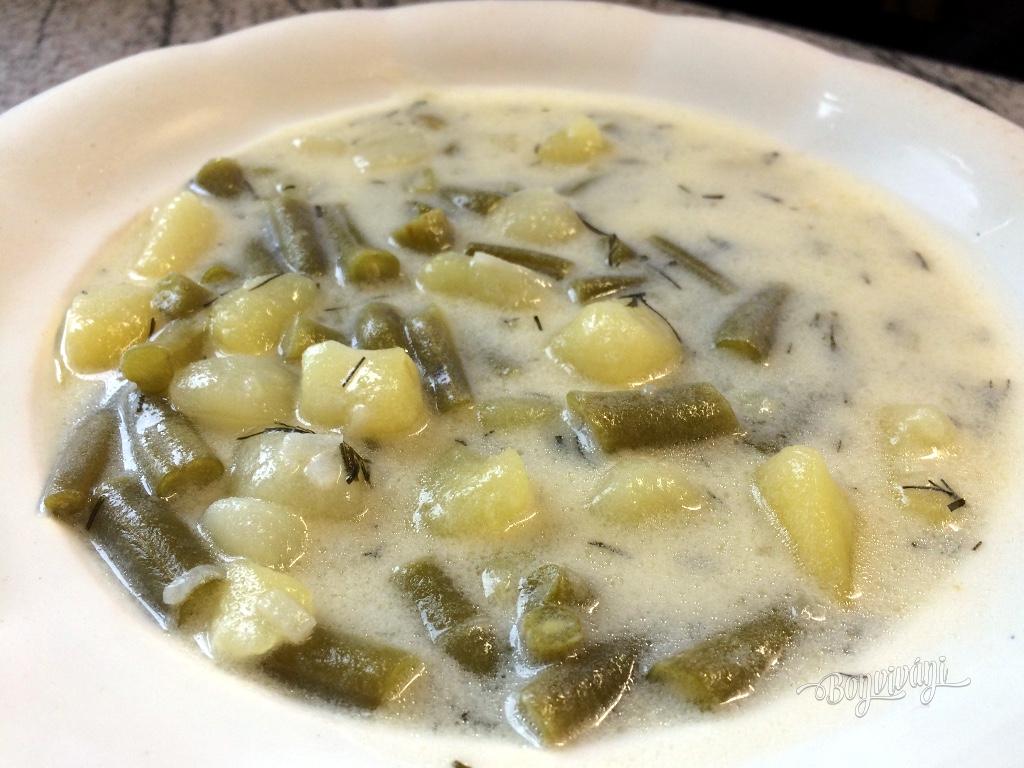 Mäkké žlté fazuľkové strúčiky umyjeme, odstránime končeky a nakrájame asi na 2 cm kúsky. Zemiaky očistíme a nakrájame na malé kocky. Do hrnca dáme variť zemiaky spolu so strúčikmi, bobkovým listom a soľou. Vody dáme len toľko, aby boli strúčiky ponorené. Kým sa strúčiky so zemiakmi varia, urobíme zápražku z oleja, masla, na jemno nasekanej cibuľky a múky.