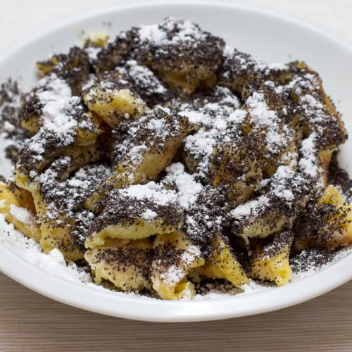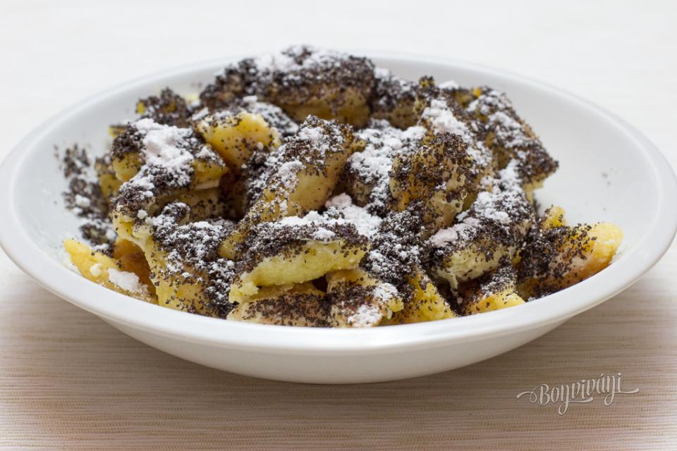 Hotový žúlanec je od spodu aj zvrchu do chrumkava upečený (voní to krásne, ako keď sa peci pečú zemiaky v šupke) a vnútri musí byť tiež upečený. Do misky dáme rozpustiť maslo a upečený ešte teplý žúlanec do masla natrháme. V masle tieto malé kúsky premiešame a dáme na tanier. Posypeme mletým makom a cukrom.