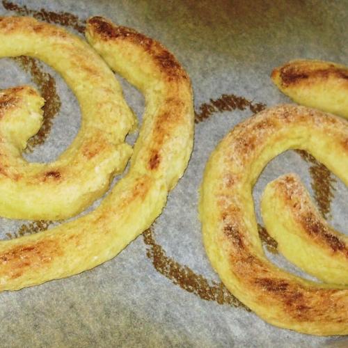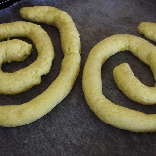 V šupke uvarené teplé zemiaky ošúpeme a ešte teplé ich postrúhame na dosku, kde máme nasypanú trošku osolenú múku. Rozmrvíme spolu a ihneď spracujeme cesto. Zemiaky by nemali byť suché, toto sa robí zo starých zemiakov, ktoré sú lepivé. Z tohoto cesta "užúlame" dlhý tenší valec cez celú dosku, radšej dva-tri tenšie. Na papier na plech tento žúlanec zvinieme do kruhu, ale tak, aby sa nespojil. Dáme do vyhriatej rúry piecť na 170 stupňov asi 40 minút do zlatista.