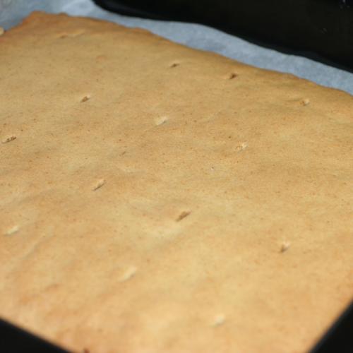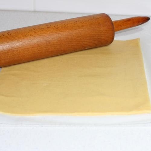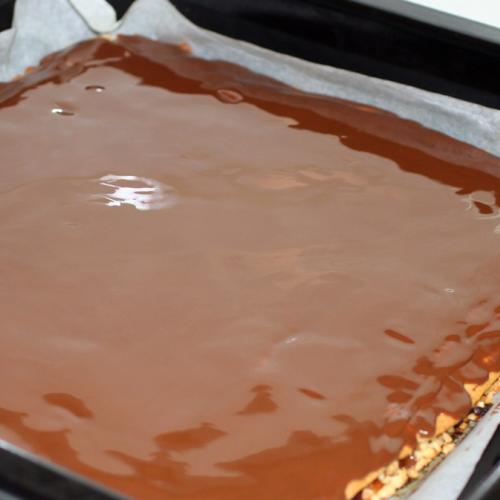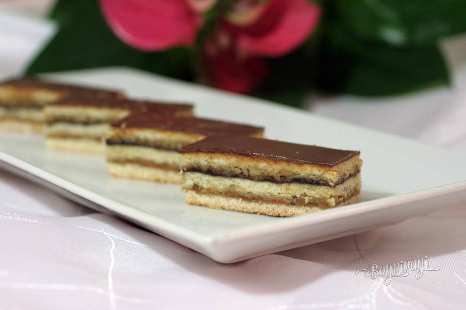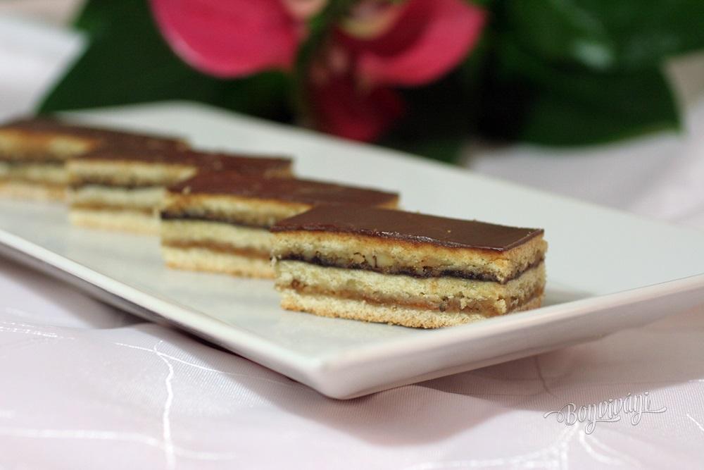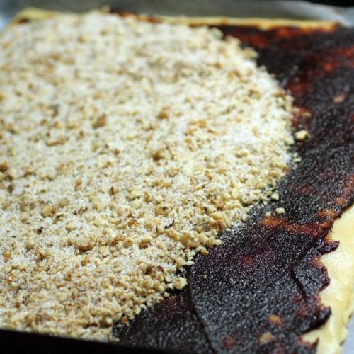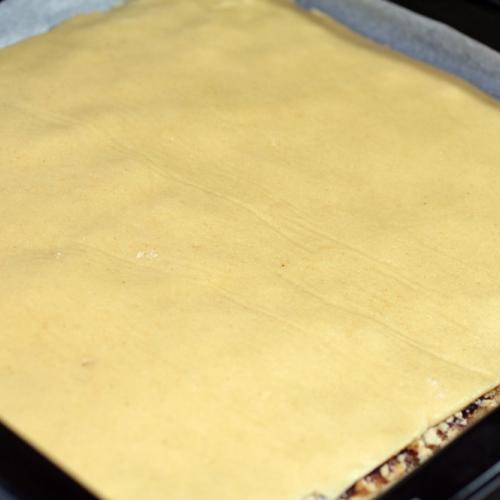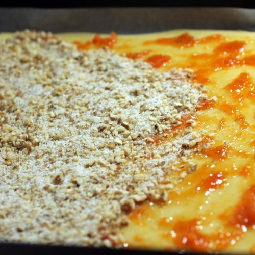 Na plech položíme jeden papier s cestom, natrieme lekvárom, alebo domácim džemom. Netreba veľa, stačí jemná vrstva. Na džem nasypeme polovicu osladených orechov. Rozvrstvíme ich rovnomerne po celej ploche až ku krajom. Vezmeme druhý papier, na ktorom je cesto, otočíme ho naopak a cestom dolu položíme na orechy. Papier z cesta stiahneme preč a dlaňami jemne cesto pritlačíme. Papier odložíme na ďalšie použitie, pretože poslúžil len ako pomôcka na uľahčenie prenosu cesta. Tie šikovnejšie gazdinky isto použijú valček, ale začínajúce kuchtičky majú s týmto problém. Toto druhé cesto takisto potrieme lekvárom, alebo džemom. Posypeme zbytkom sladkých orechov, ktoré dlaňou roztiahneme po lekvári.