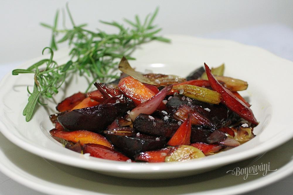 Opečenú zeleninu polejeme citrónovou šťavou, pridáme med, balzamico a rozmarín. Premiešame, zelenina dostane krásnu glazúru, nasiakne pochutinami. Vtedy vložíme panvicu do rúry a pečieme prvých desať minút na 220 stupňov. Potom teplotu znížime na 180 a pečieme za občasného premiešania ešte asi 20 minút.