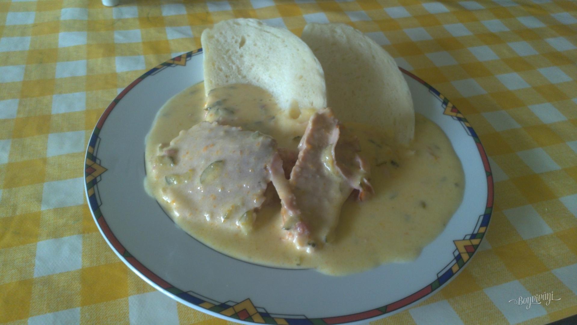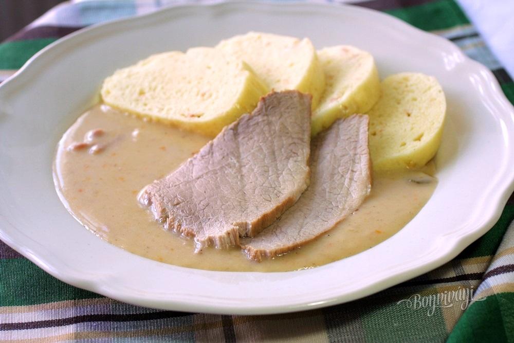 Povaríme spolu ešte asi 5 minút. Nakrájame mäso a podávame s domácou knedľou.