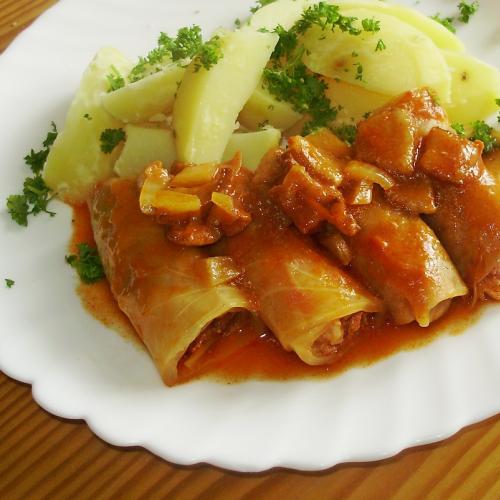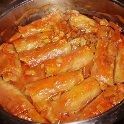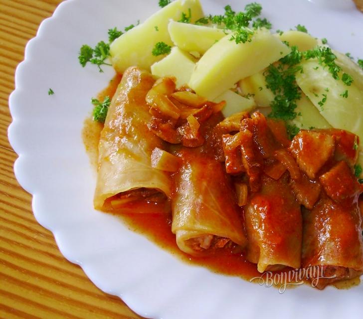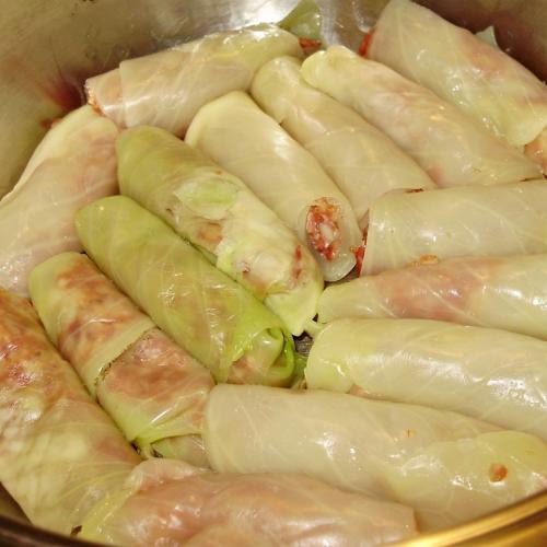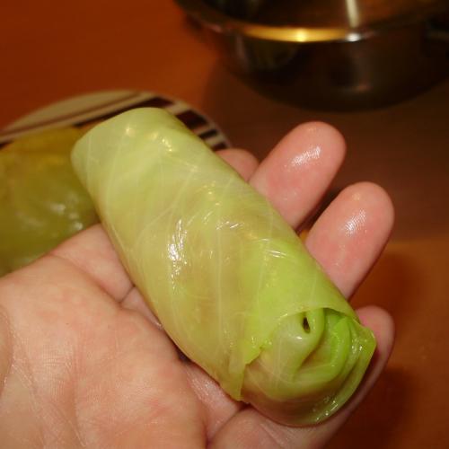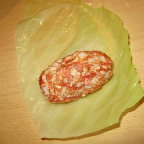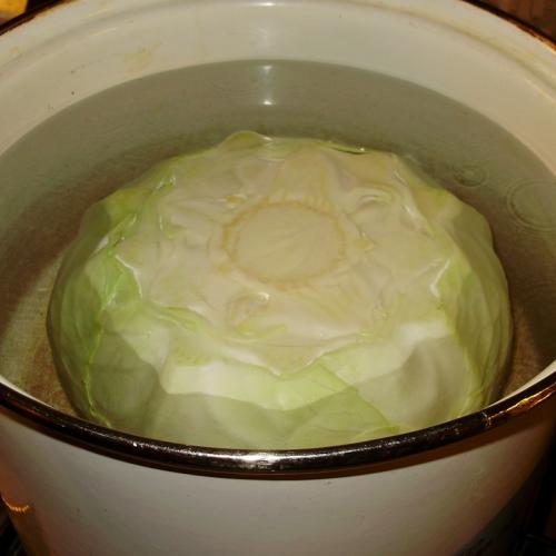 Na kapuste odkrojíme spodnú časť a celú hlávku ponoríme do hrnca s vriacou vodou. Necháme povariť, aby listy zmäkli. Povarenú kapustu vyberieme a oberieme z nej vrchné listy, ktoré použijeme na balenie. Zbytok kapusty necháme vychladnúť a odložíme do chladu na iné použitie. Tých listov treba asi len 12.