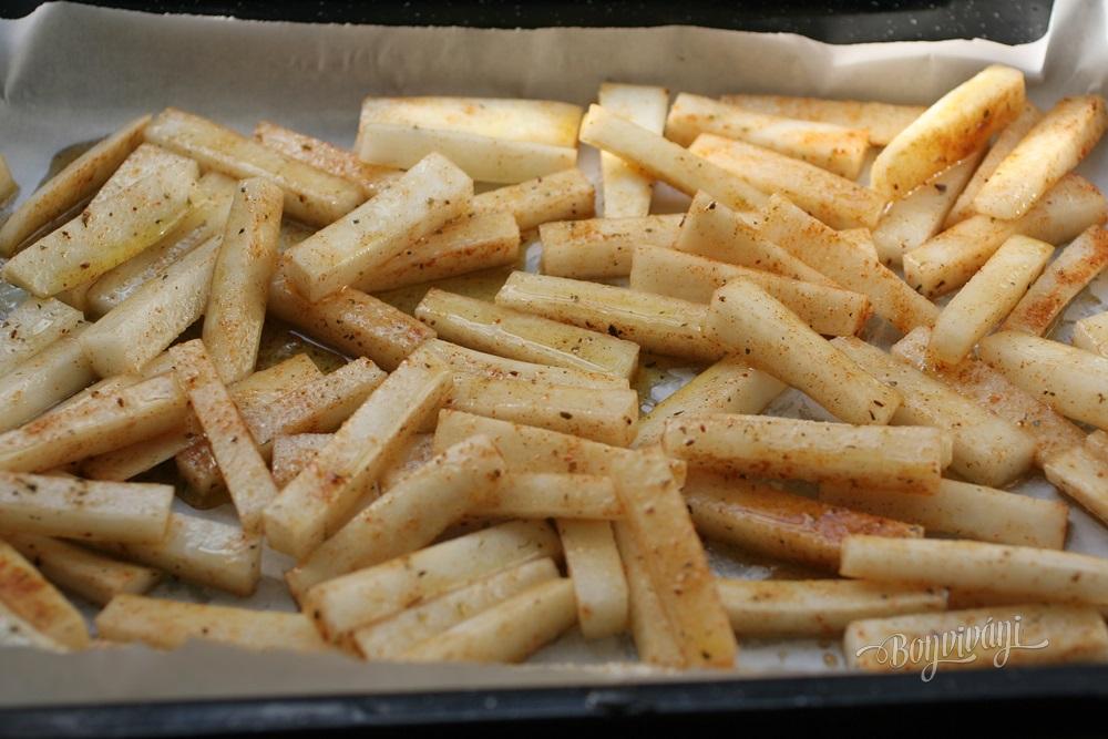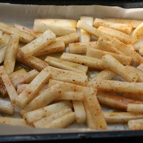 Recept je veľmi jednoduchý, korenie môžete použiť svoje obľúbené a hranolky môžete podávať ako prílohu k jedlu, alebo ako hlavný chod s rôznymi omáčkami.