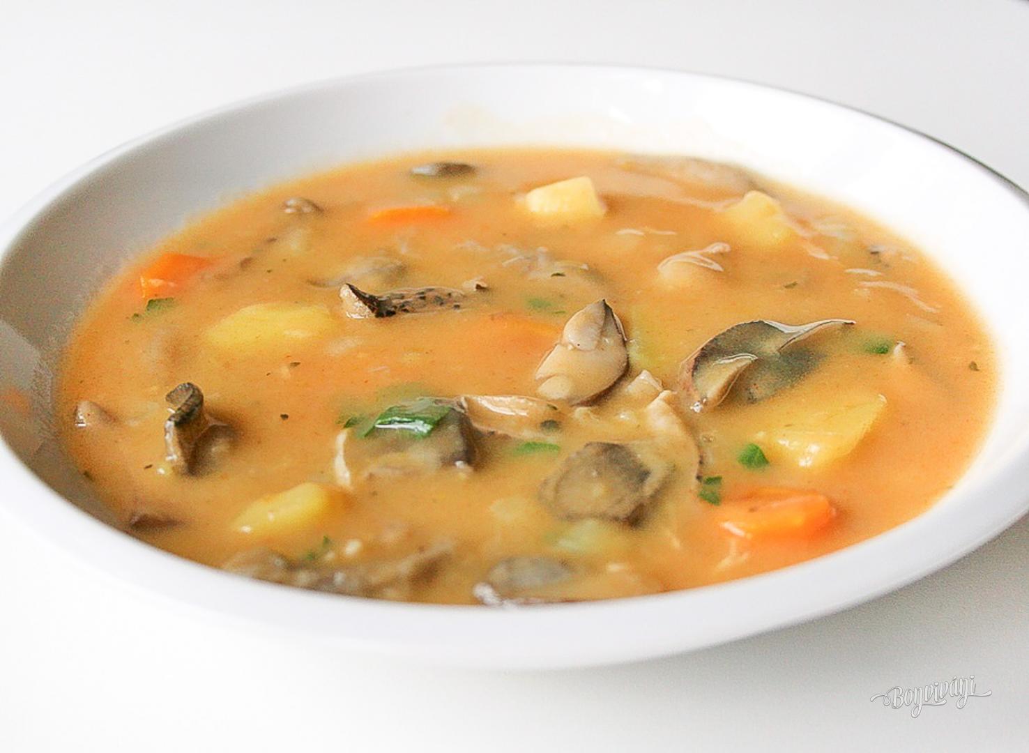 Na troche oleja orestujeme nasekanú cibuľu, pokrájané huby, nakrájané zemiaky a mrkvu. Posolíme, pridáme korenie, premiešame a zalejeme asi jeden a pol litrom vody. Uvaríme do mäkka.