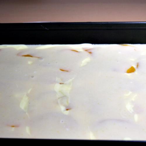 Na plech dáme papier na pečenie a nalejeme naň polovicu hustého cesta, naň vylejeme cik-cak riedke cesto a poukladáme nakrájané broskyne. Všetko zalejeme zbytkom hustejšieho cesta.