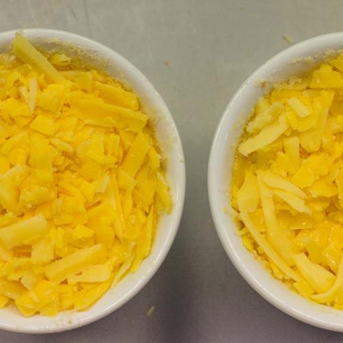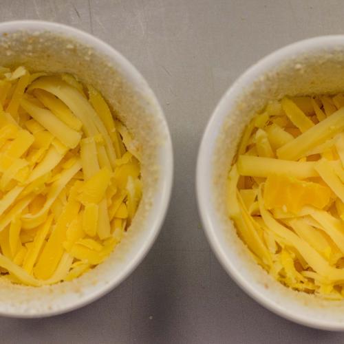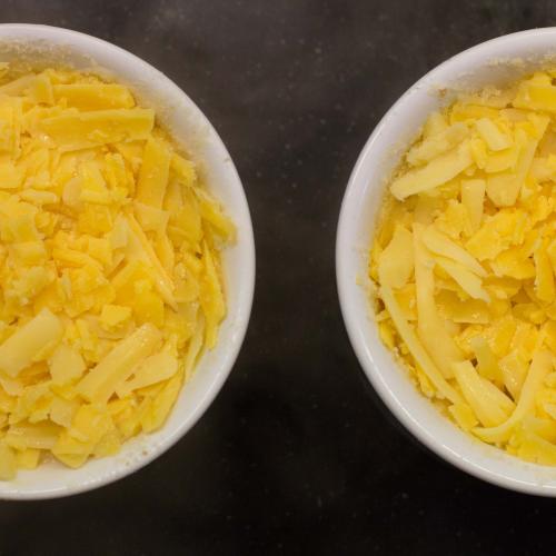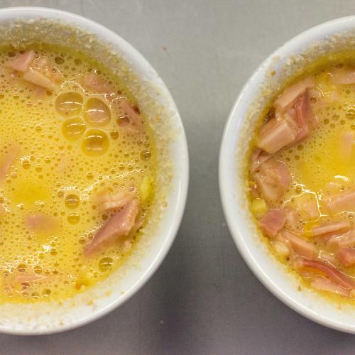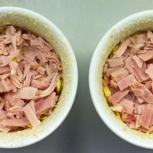 Syr nastrúhame, šunku nakrájame na kúsky a vajíčka rozšľaháme. Začneme vrstviť. Najprv na spodok hrnčeka vložíme polovicu syra.