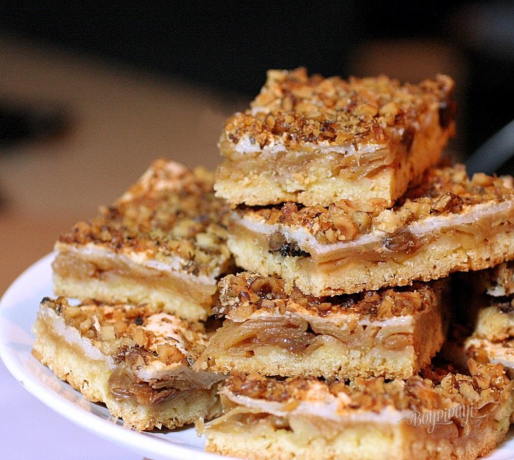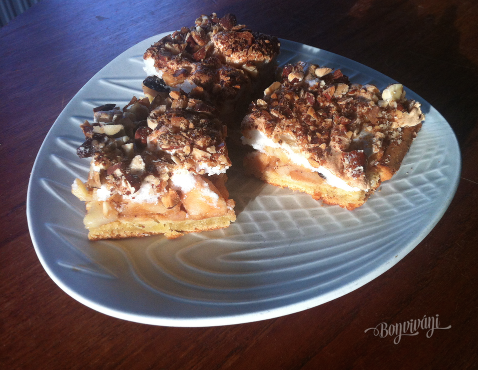 Opäť jeden jablkový koláč, so snehom a orieškami. Vynikajúci šťavnatý jablkový koláč s vôňou pečených orechov.