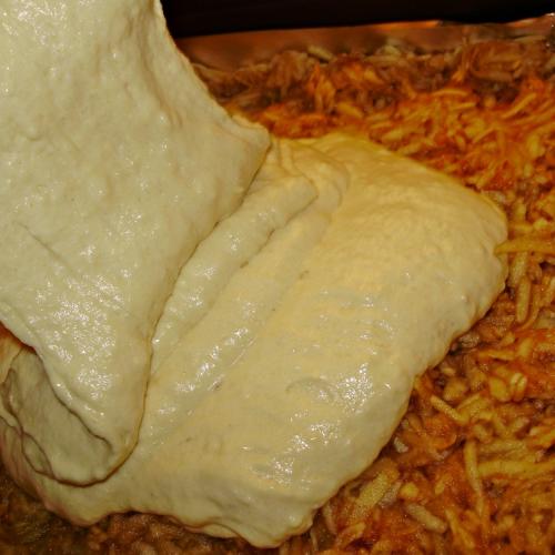 V miske vyšľaháme zvlášť bielky. V druhej miske zase žĺtky s cukrom a citrónovou šťavou do peny. Obe zmesi zľahka spojíme a pridáme preosiatu múku s kypriacim práškom. Touto zmesou zatrieme jablkovú zmes a dáme piecť do vyhriatej rúry na 180 stupňov, kým nie je cesto upečené.