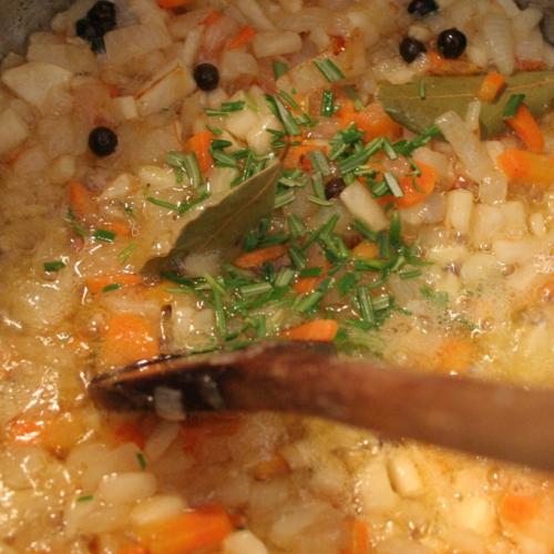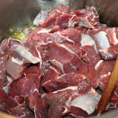Maličké kocky slaniny orestujeme na masti spolu s nasekanou cibuľou. Pridáme na malé kocky nakrájanú koreňovú zeleninu a restujeme, kým skaramelizuje, spolu s borievkou, rozmarínom, novým korením, celým čiernym korením, bobkovým listom a cesnakom. Do tohoto základu vložíme na väčšie kocky nakrájané jelenie gulášové mäso.