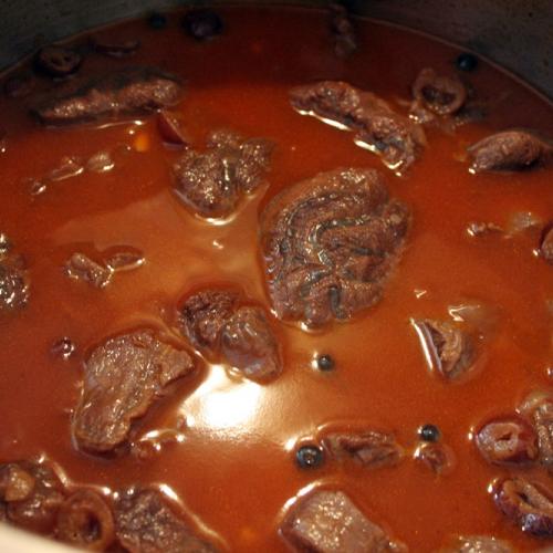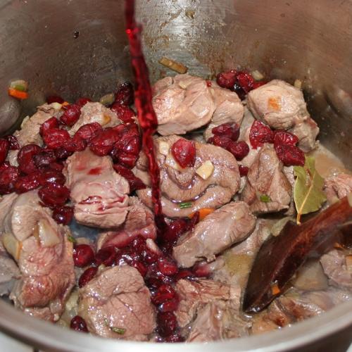 Mäso miešame, aby sa zo všetkých strán zatiahlo, potom ho osolíme (nie veľa, lebo prilejeme ešte vývar, ktorý je osolený) a pridáme štipľavú papriku. Prisypeme brusnice, podlejeme vínom a povaríme, aby sa časť vína odparila. Potom podlejeme hovädzím vývarom, zakryjeme a pomaly dusíme, kým mäso nezmäkne. Občas premiešame. Uvarený guláš zahustíme strúhaným perníkom, čím získame originálnu chuť. Ak nemáte možnosť kúpiť perník na strúhanie, jednoducho si ho upečte, ako som napríklad pri tomto recepte na zajaca na čierno.