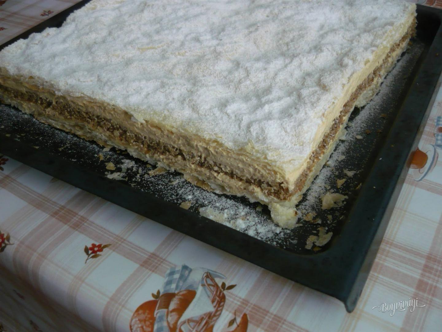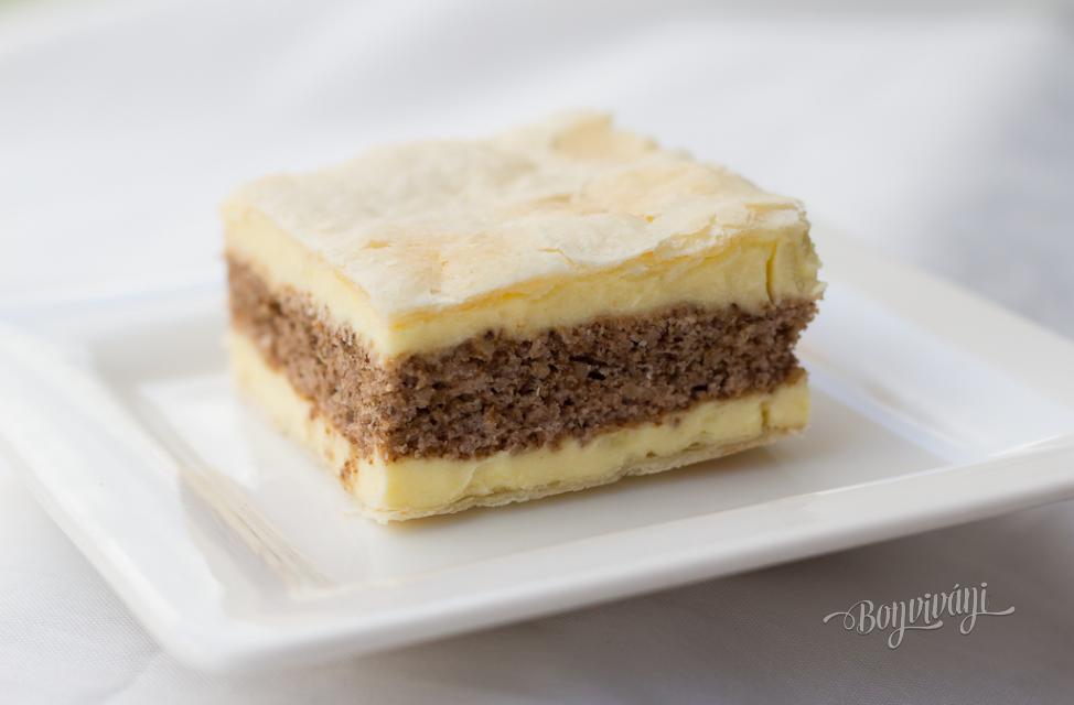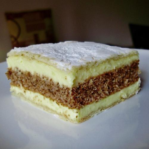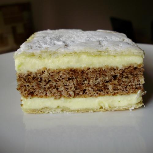 Možno tento krémeš poznáte. Je to starý recept a krémeš sa mi vždy vydarí. Spodný a vrchný plát tvorí lístkové cesto, stredná piškóta je orechová a krém je klasický pudingový s maslom a rumom.