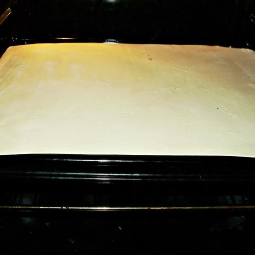 Potom dáme plát orechový. Položíme ho na krém vrchnou stranou a stiahneme papier. Orechový plát potrieme druhou polovicou krému a zakryjeme druhým lístkovým plátom. Dlaňami pritlačíme, aby sa krémeš spojil, celý plech zakryjeme fóliou a dáme do chladničky odležať na pár hodín. Lístkové cesto krásne zmäkne od krému a krája sa jedna radosť.